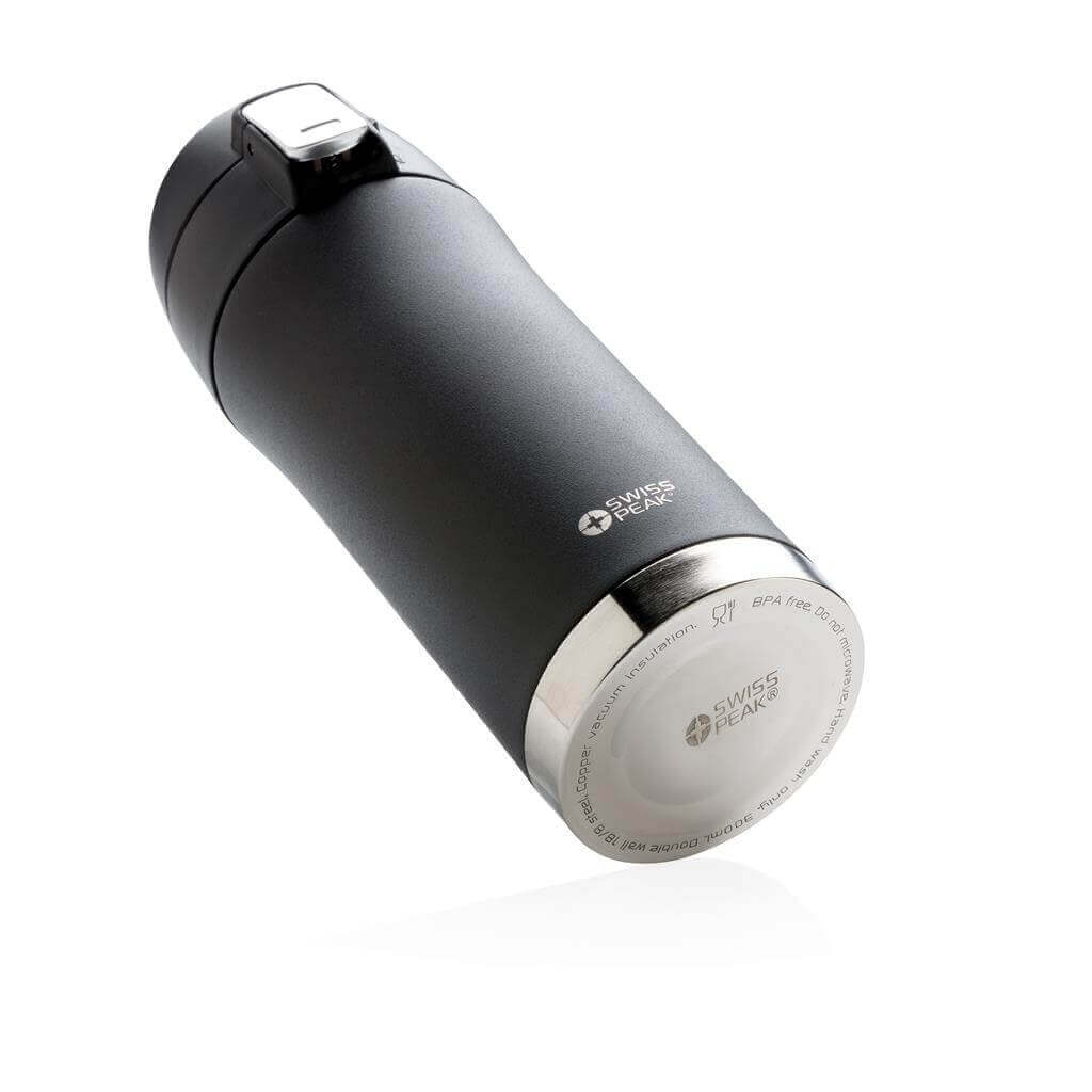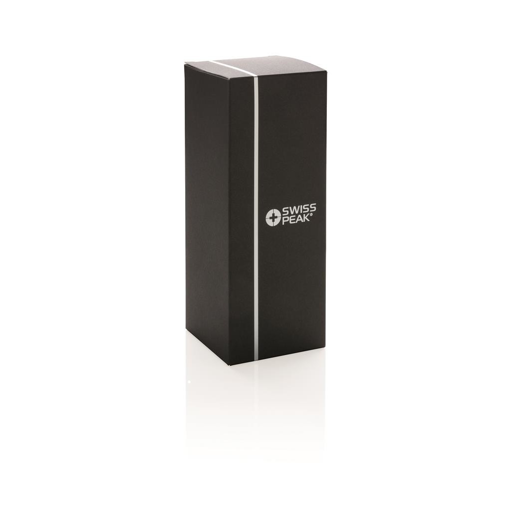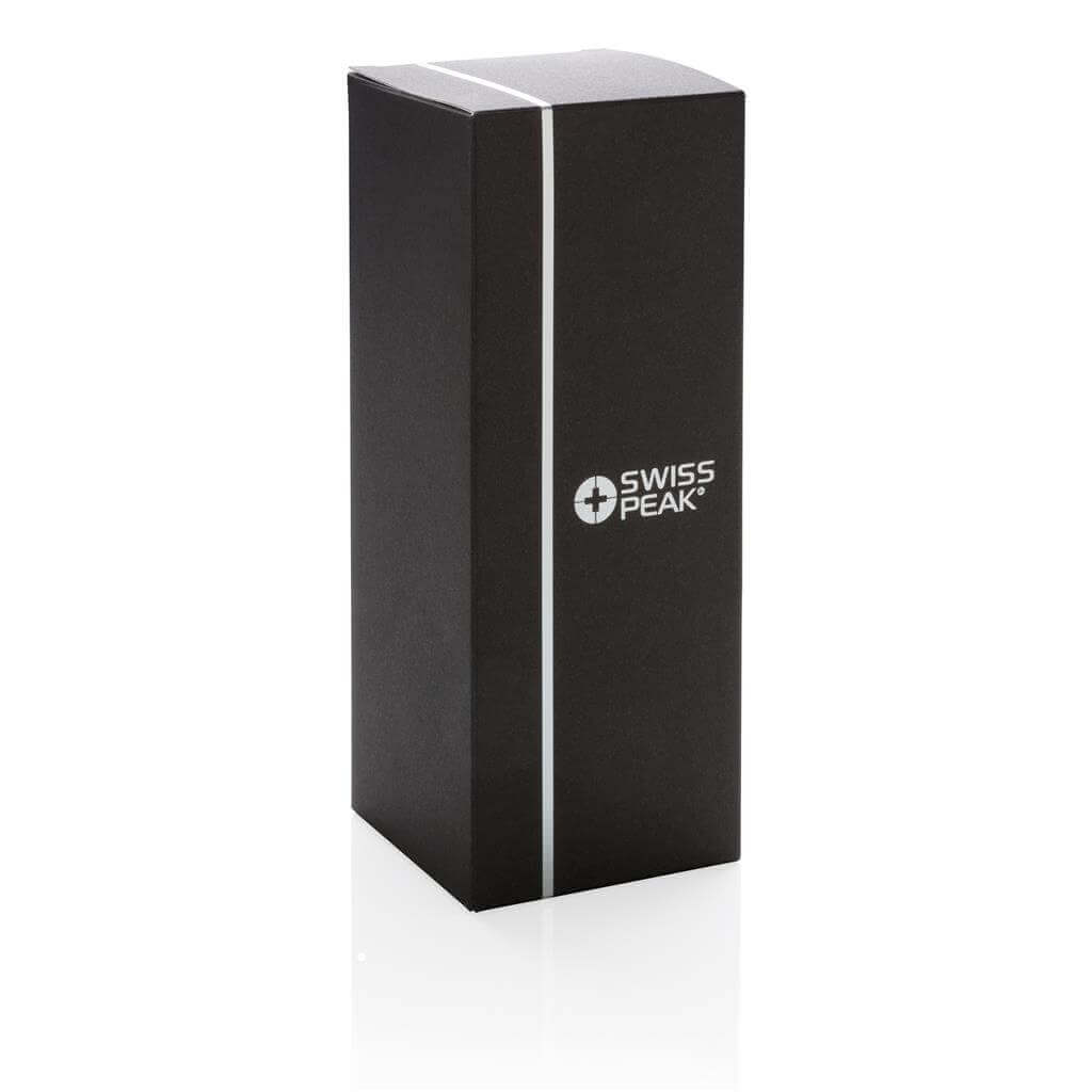 Řada Swiss Peak Elite vyčnívá použitím dvojstěnné vakuovo měděné izolace a nerezavějící oceli 18/8. Kvalitní matný černý nástřik zaručeně vydrží bez vyblednutí či popraskání. Vnitřní stěna je osazena měděnou izolací, díky které vaše nápoje zůstanou horké po dobu až 8 hodin a studené až po 24 hodin. Pouze pro ruční mytí, díky uzávěru nepropustná. Objem 300 ml. PMS color 1: Black