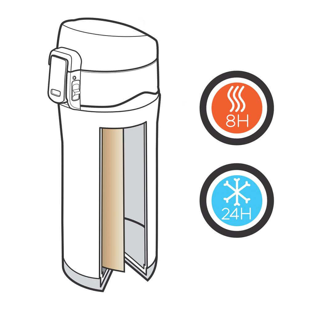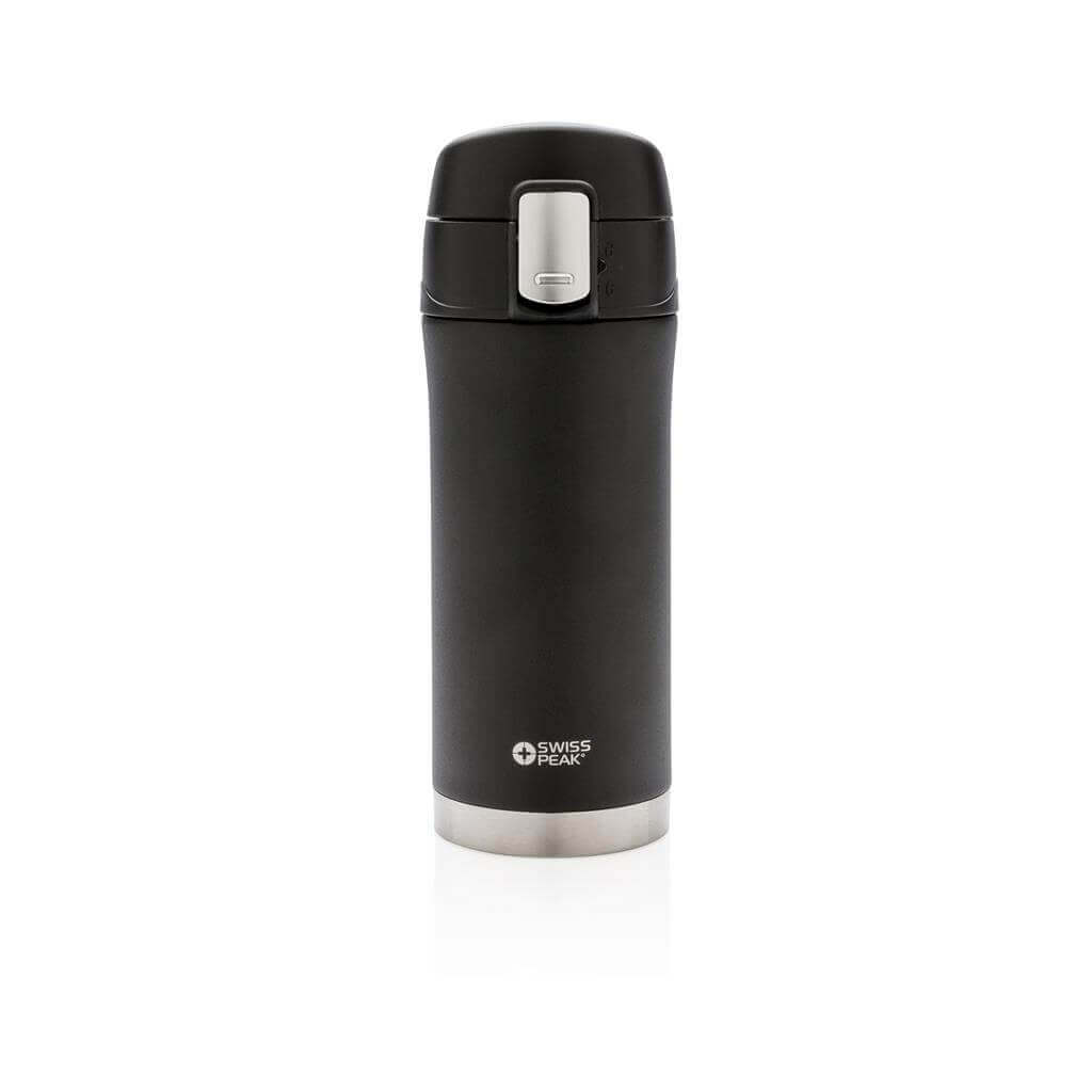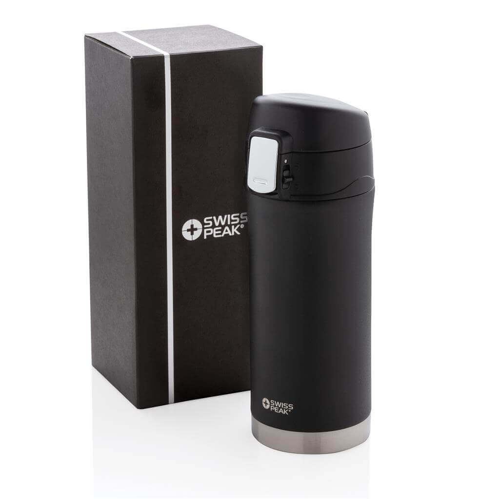 Řada Swiss Peak Elite vyčnívá použitím dvojstěnné vakuovo měděné izolace a nerezavějící oceli 18/8. Kvalitní matný černý nástřik zaručeně vydrží bez vyblednutí či popraskání. Vnitřní stěna je osazena měděnou izolací, díky které vaše nápoje zůstanou horké po dobu až 8 hodin a studené až po 24 hodin. Pouze pro ruční mytí, díky uzávěru nepropustná. Objem 300 ml. PMS color 1: Black