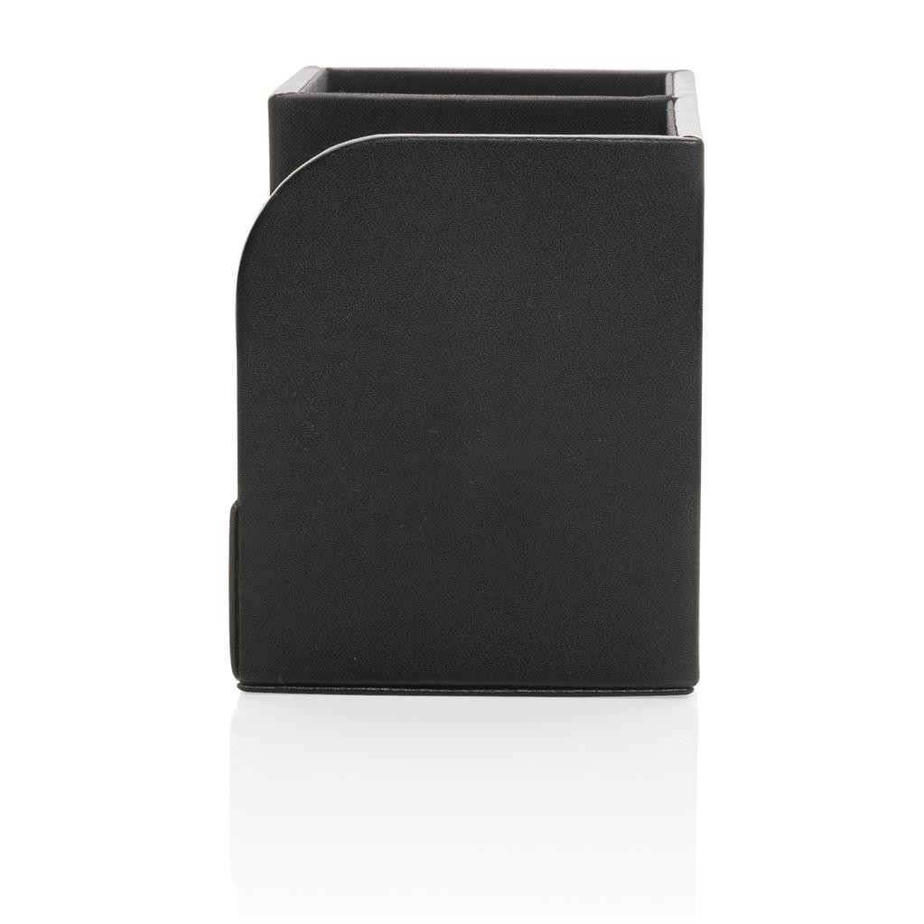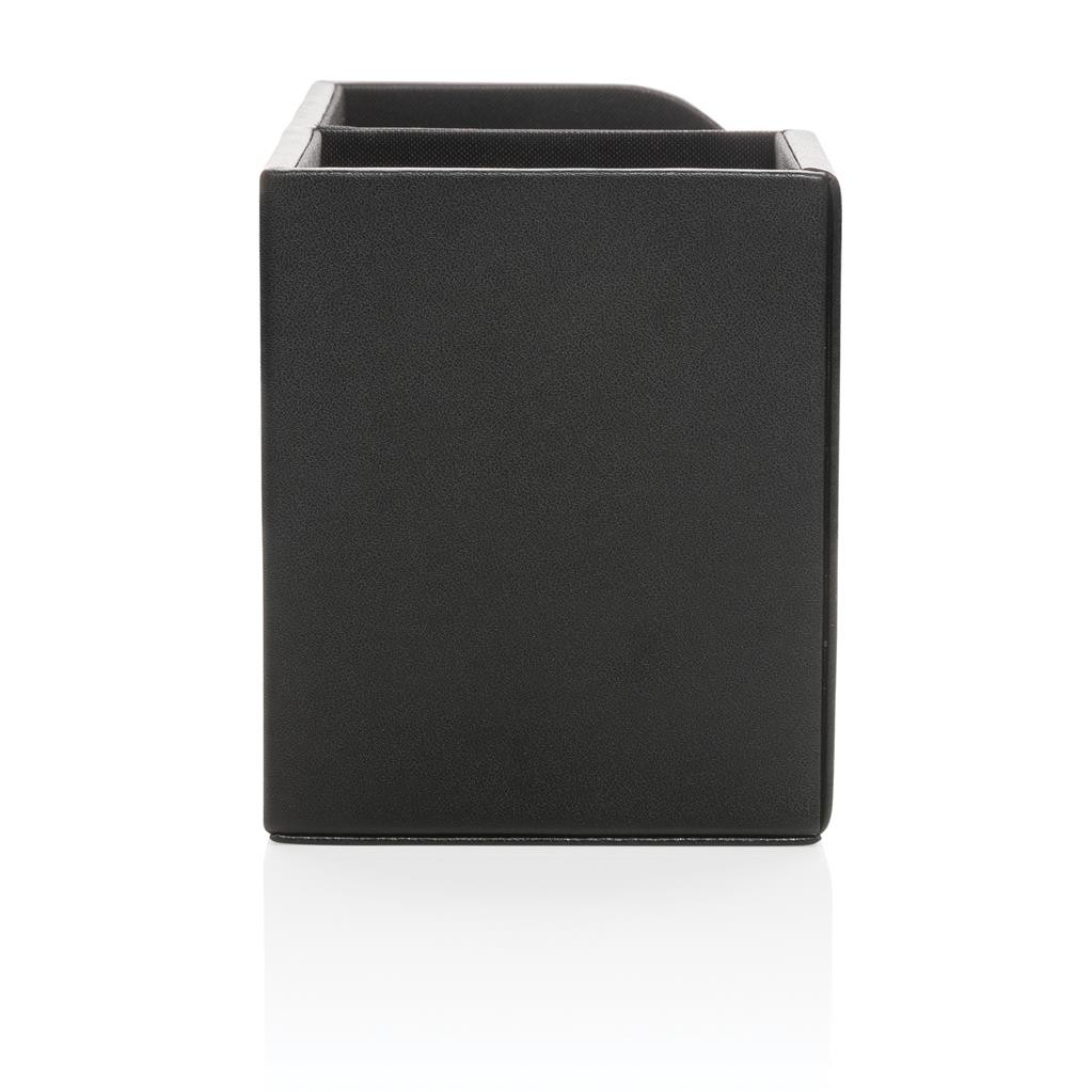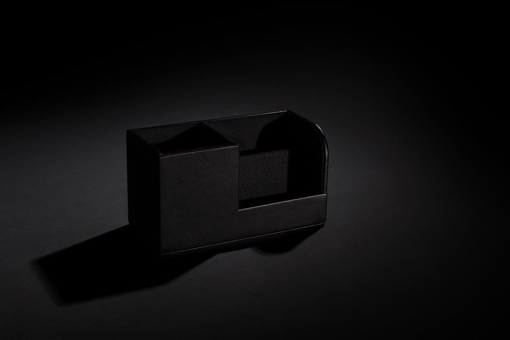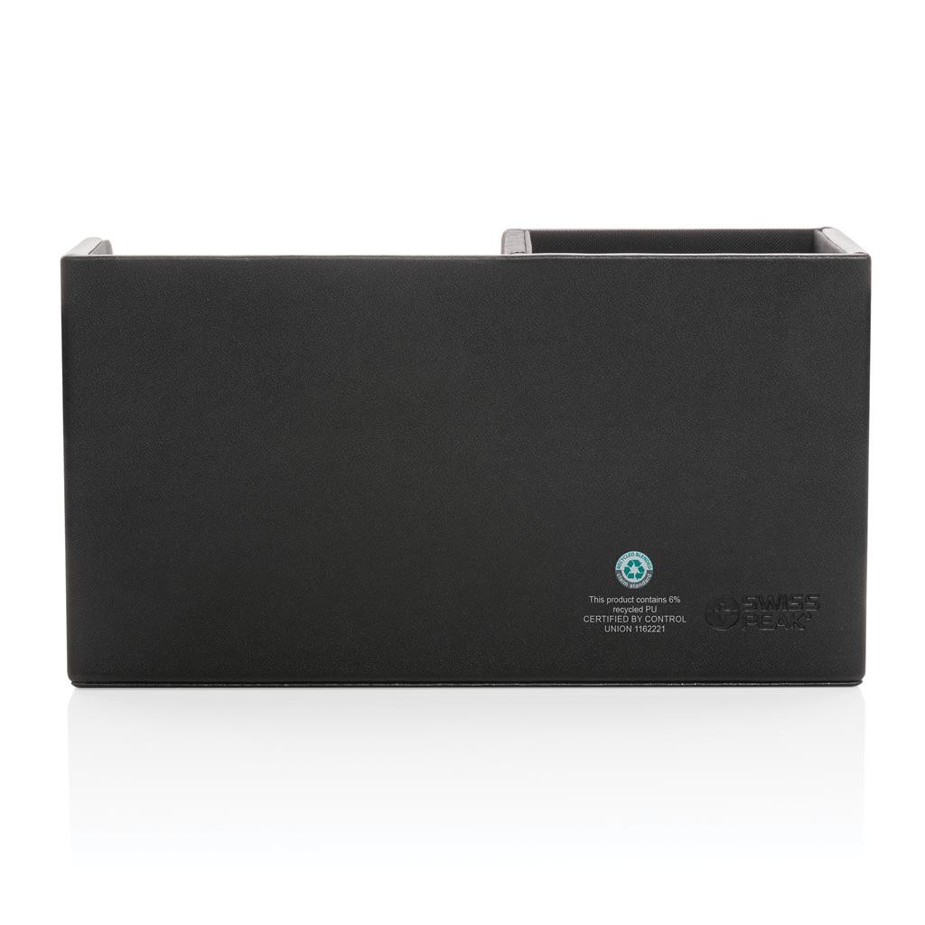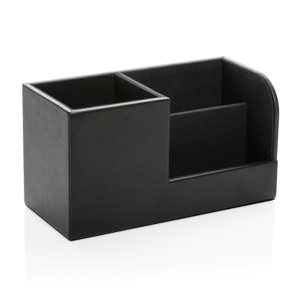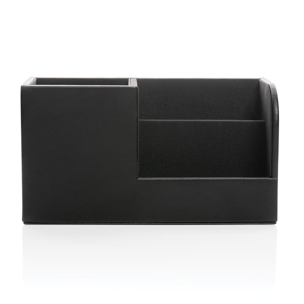 Luxusní organizátor na pracovní stůl k uchování důležitých pracovních potřeb po ruce. Vnější povrch je vyroben z příjemné recyklované PU kůže s RCS certifikací. RCS (recycled claim standard) zaručuje kompletně certifikovaný dodavatelský řetězec, čímž lze garantovat skutečné obsažení recyklátu. Vnitřní část je vyrobena z MDF dřeva. Celkový podíl recyklátu dle váhy produktu: 6,5 %. Bez PVC.