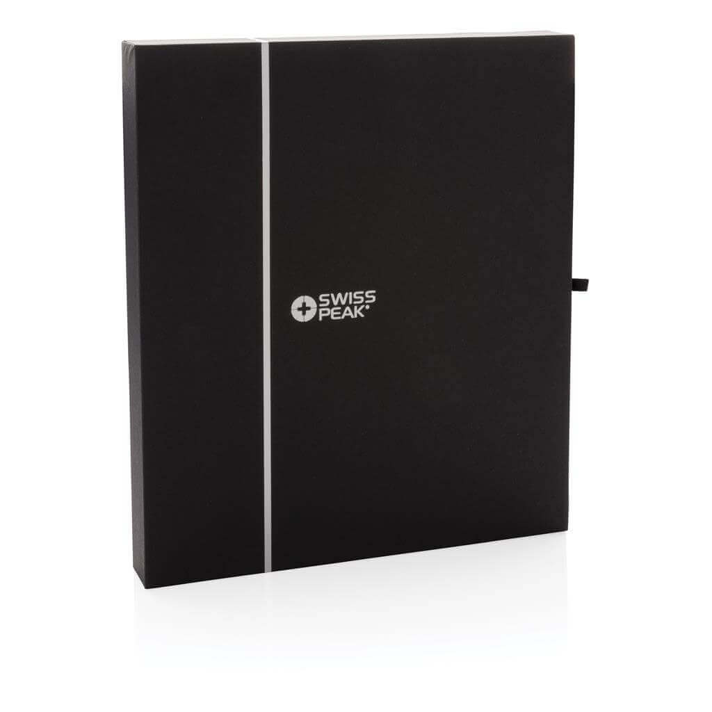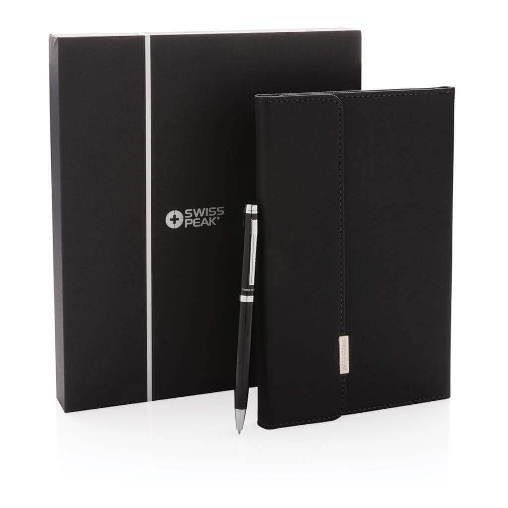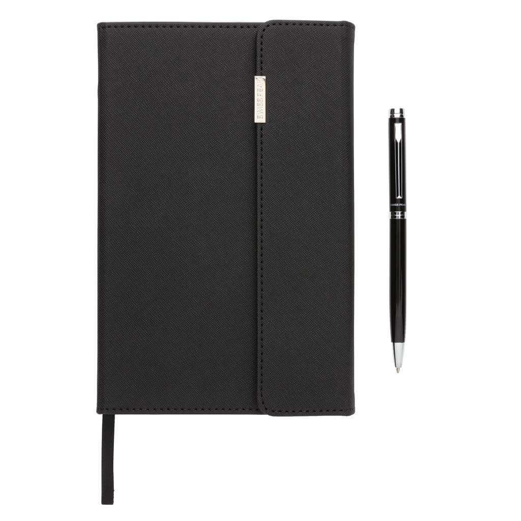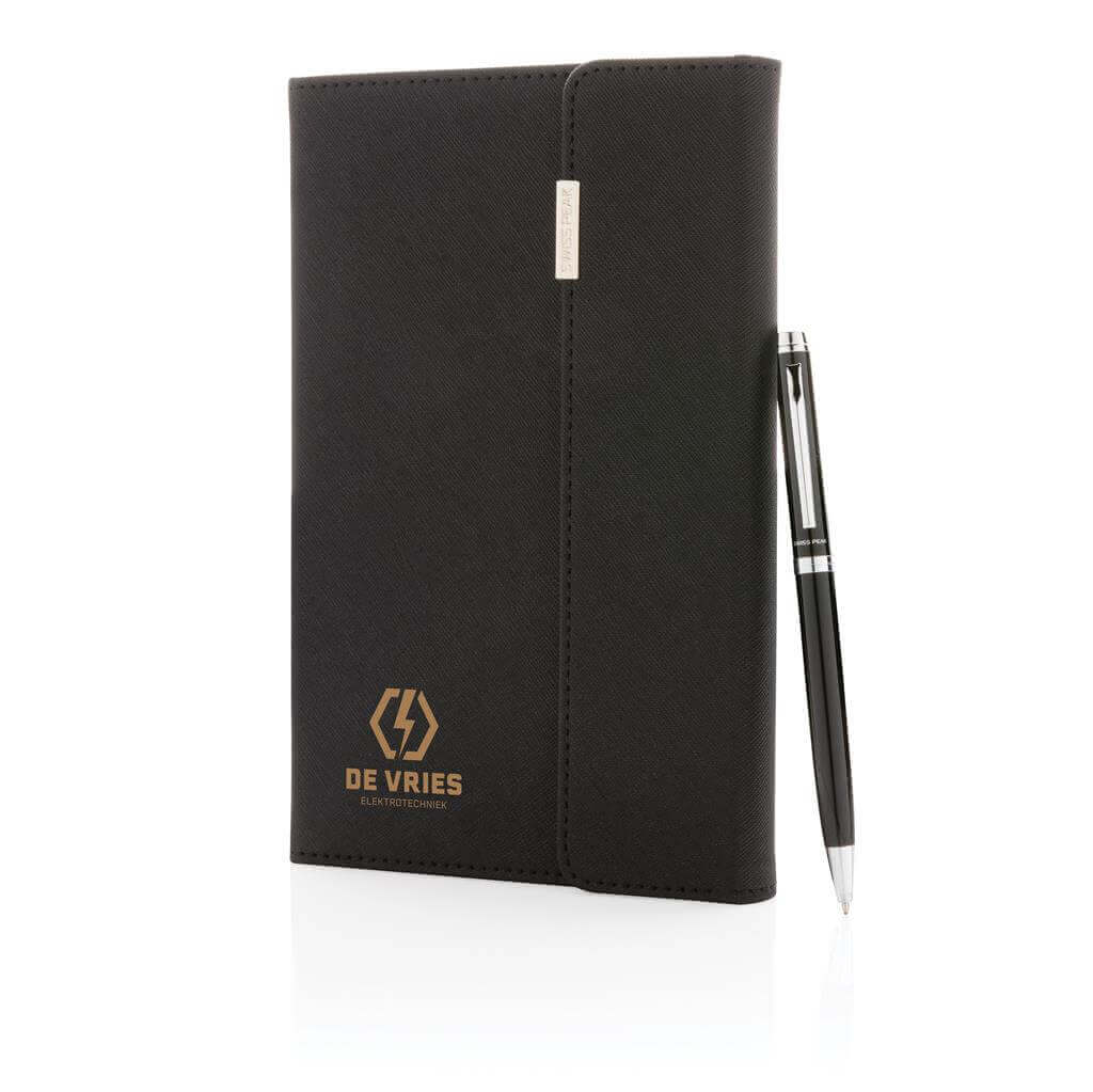 Prémiový set poznámkového bloku a pera v černém uhlazeném designu. Poznámkový blok se vzorovaným obalem z PU a kovovým logem obsahuje 80 listů/160 stran linkovaného krémového papíru o gramáži 80g/m2. Pero obsahuje německý inkoust pro psaní až 1 200m textu. Baleno v luxusní dárkové krabičce. PMS color 1: Black