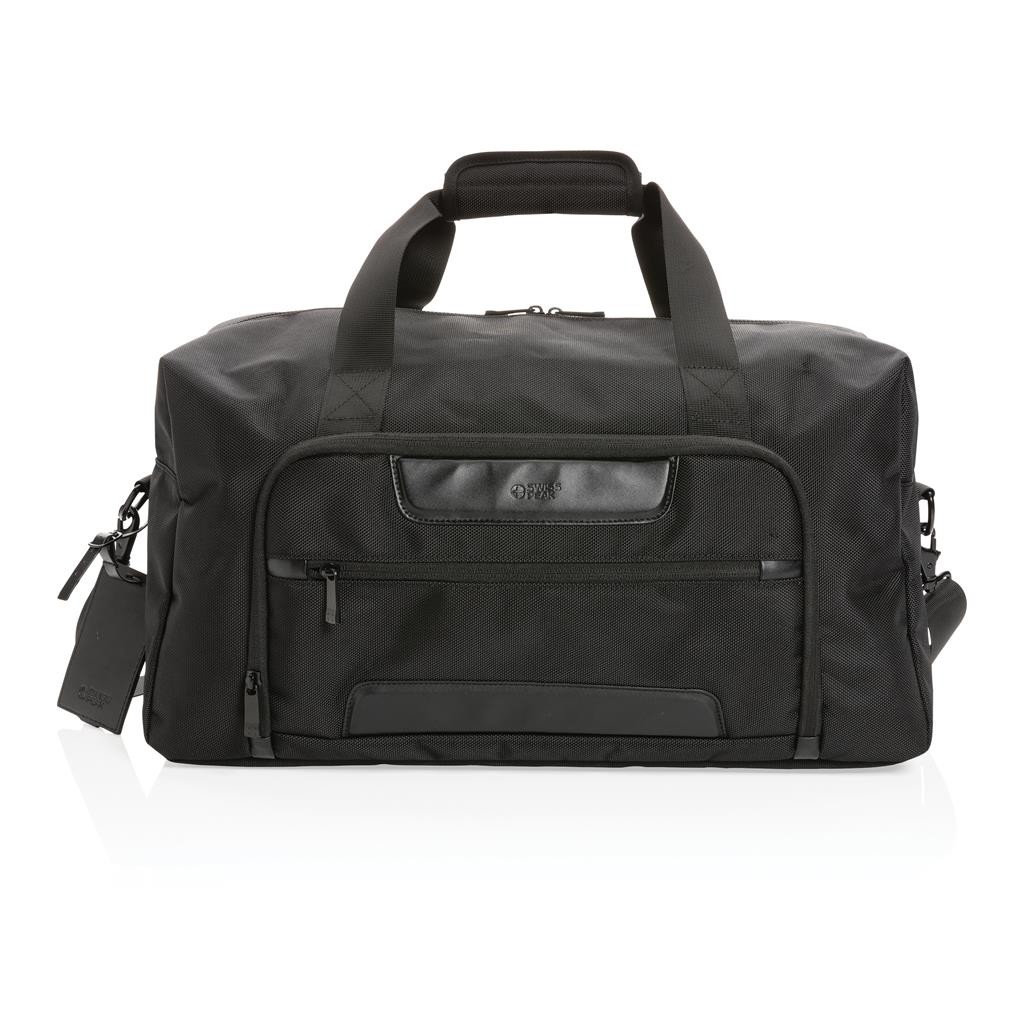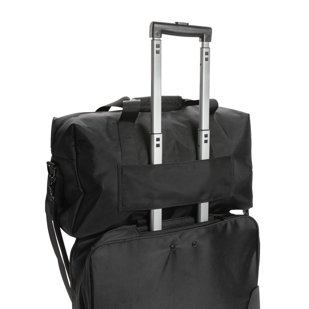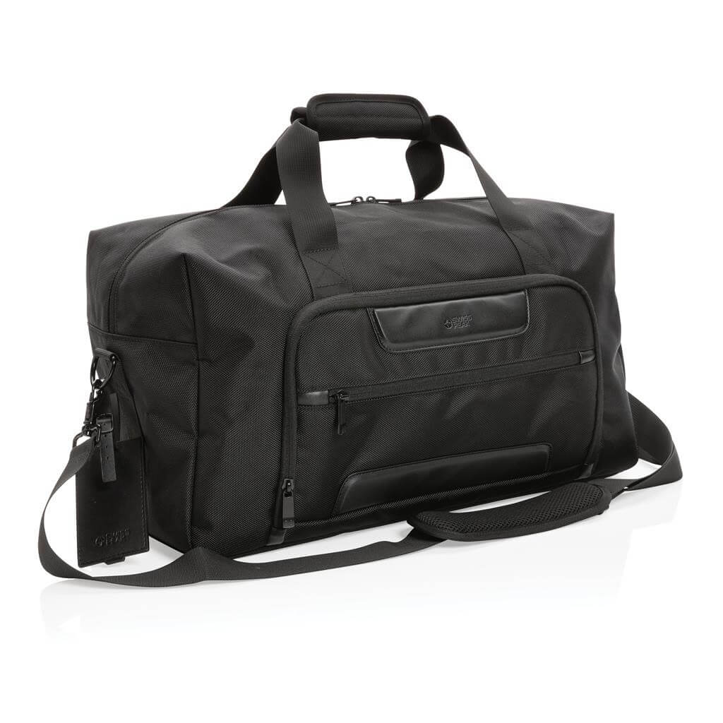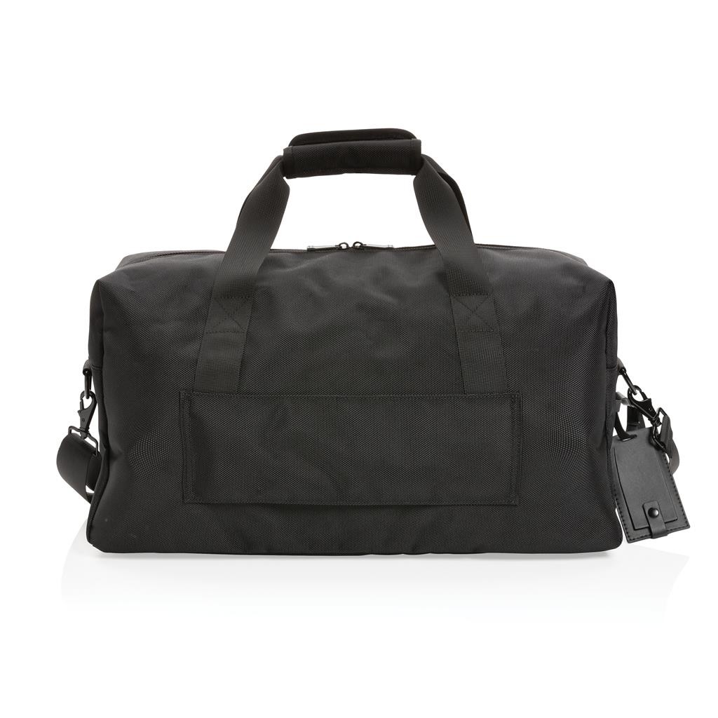 Elegantní skvěle vybavená taška ideální pro víkendové cestování. Vyrobená z pevného recyklovaného polyesteru 1680D s bohatými detaily z umělé kůže a množstvím kapes. Prostorný hlavní oddíl, vnitřní kapsa na zip, přední kapsa na zip s množstvím přihrádek, kapsy s RFID ochranou a odnímatelný kontaktní štítek. Složení: vnější část: 100 % 1680D recyklovaný polyester; vnitřní část (podšívka): 150D recyklovaný polyester. Včetně skenovatelné složky AWARE™ garantující obsah recyklátu. Na výrobu bylo využito 50,7 500ml PET lahví a bylo uspořeno 30,2 litrů vody. Z výtěžku každého prodaného produktu je navíc přispěno 2 % na podporu iniciativy Water.org.