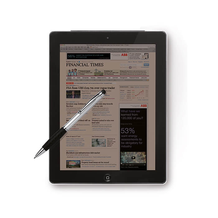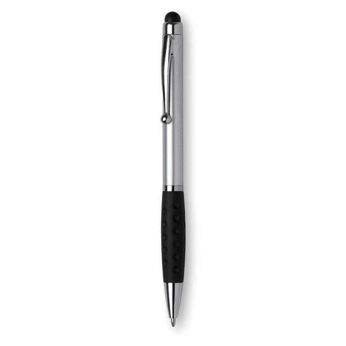 Otočné plastové kuličkové pero s kovovým povrchem, ABS rukojetí a citlivým silikonovým hrotem pro zařízení s dotykovým displejem. Modrý inkoust.