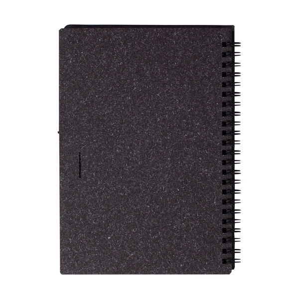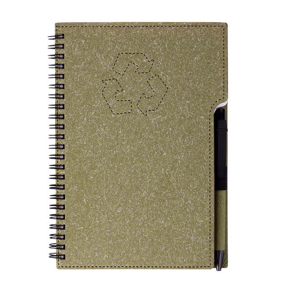 Ekologický zápisník v pevné vazbě s držákem na pero a kuličkovým perem s modrou náplní. 70 linkovaných děrovaných listů (70 g/m2). Vazba i papír jsou vyrobeny z recyklovaných materiálů a lze je opět recyklovat. Tělo pera je z kartonu, klip, hrot a tlačítko z recyklovatelného plastu.