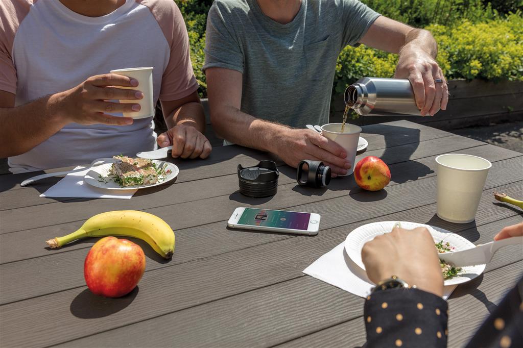 Nepropustná termo láhev. Vyrobená z nerezavějící oceli (uvnitř 304 SS, vně 201 SS). Ve spodní části je vybavena odnímatelným bezdrátovým reproduktorem. 450 mAh baterie umožňuje poslech hudby po dobu 4...
