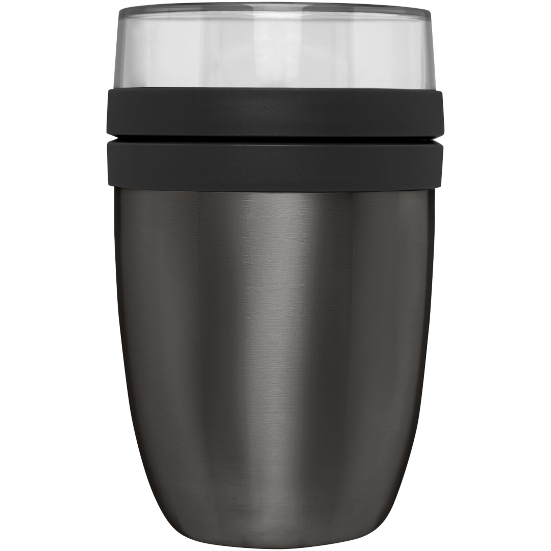 Termo obědový box s dvěma navzájem oddělenými přihrádkami. Obě přihrádky mají samostatné víčko, takže se jejich obsah nepromíchá. Udrží potraviny teplé až 8 hodin a studené až 12 hodin. Abyste měli jistotu, že jídlo si co nejdéle udrží požadovanou teplotu, doporučujeme ještě před naplněním vypláchnout box horkou nebo naopak ledovou vodou. Objem horní průhledné nádoby je 200 ml, což znamená, že může obsahovat asi 75 gramů pevných potravin. Objem spodní nádoby je 500 ml. Vyrobeno z odolného materiálu. Vnější část boxu zůstává chladná a suchá. Doporučuje se mýt ručně. Plastové části víčka lze mýt v myčce. Nepropustná. Neobsahuje BPA.