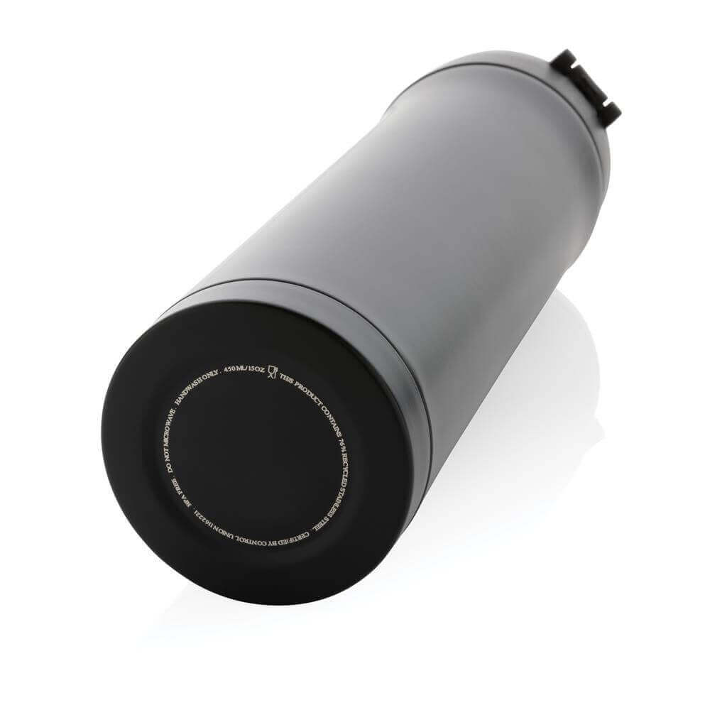 Termoska Easy lock s jedinečným designem. Uzávěr lze jednoduše ovládat jednou rukou a uzamknout pro zabránění vylití tekutiny. Uzávěr je zároveň navržený pro snadné ruční mytí i mytí v myčce nádobí. Nápoje uchová až 5h teplé a 15h studené. Průměr odpovídá většině držákům v automobilech. Vyrobená z RCS recyklované oceli. RCS (Recycled Claim Standard) je globální standard, který umožňuje ověřit použití recyklovaného materiálu v produktu napříč celým dodavatelským řetězcem. Celkový podíl recyklátu dle váhy produktu: 76 %. Objem: 450 ml. Baleno v FSC® kraftové dárkové krabičce.