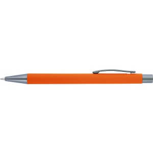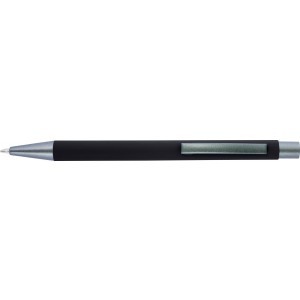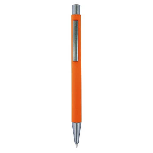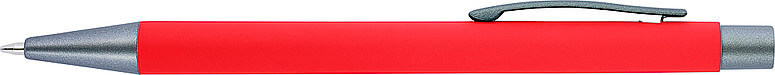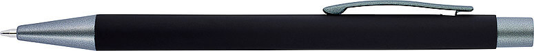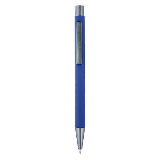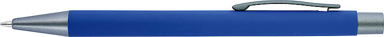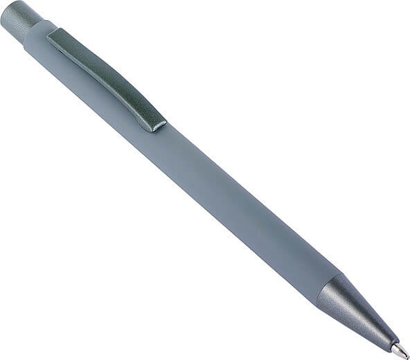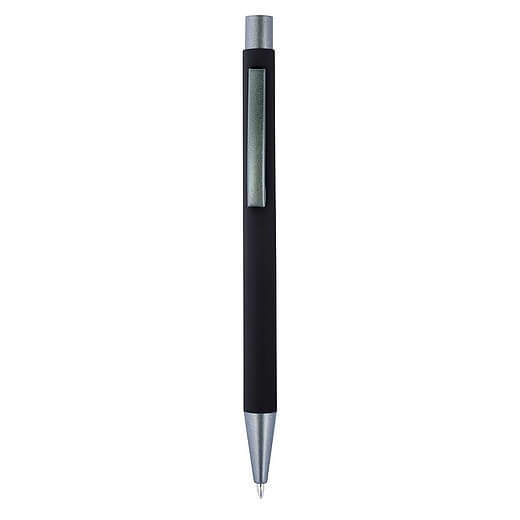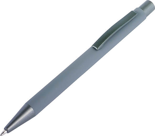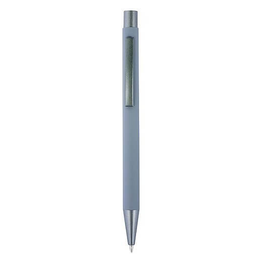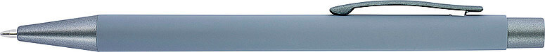 Kuličkové pero s gumovým povrchem. Špička, horní část a klip se vzájemně shodují s tmavě šedou barvou. Laserové gravírování odhaluje zrcadlový povlak pod pryžovou horní vrstvou. Modrý inkoust