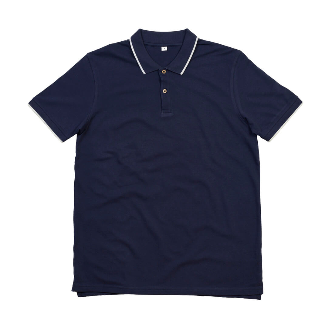 · 200 g / m² · 100% organická bavlna, mikro piqué · (Heather Grey Melange: 85% bavlna, 15% viskóza) · Proužky v kontrastní barvě na límci a manžetách · Úzký knoflík s knoflíky z kokosových skořápek · Žebrová pletenina na límci a manžety · Boční průduchy · Střih delší vzadu · Snadné označení.