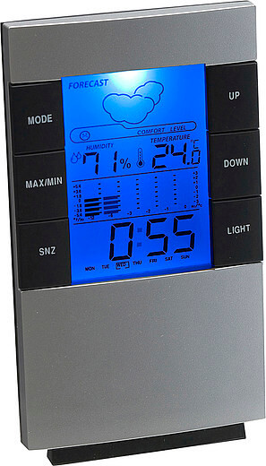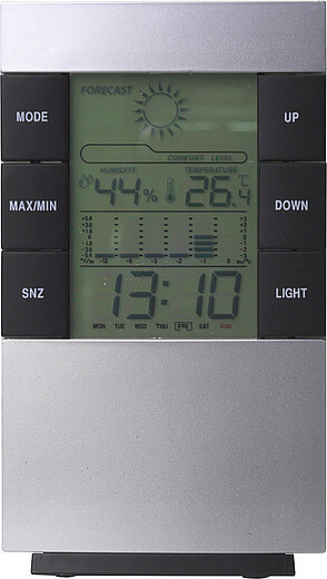 Plastová digitální stolová nebo nástěnná meteorologická stanice s hodinami, kalendářem, teplotou (C / F), informacemi o vlhkosti a podsvícením. Tuto meteorologickou stanici můžete pověsit na zeď. Včetně baterií.
