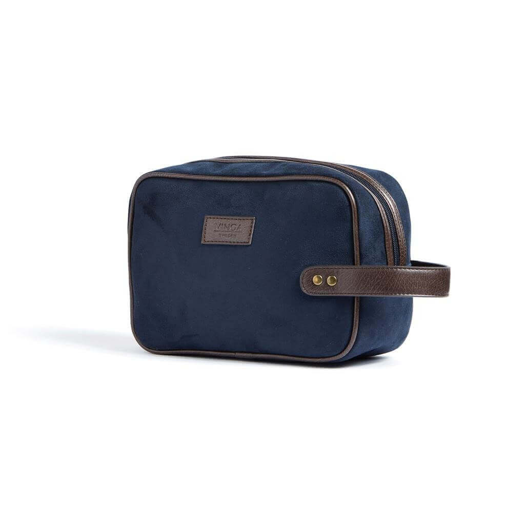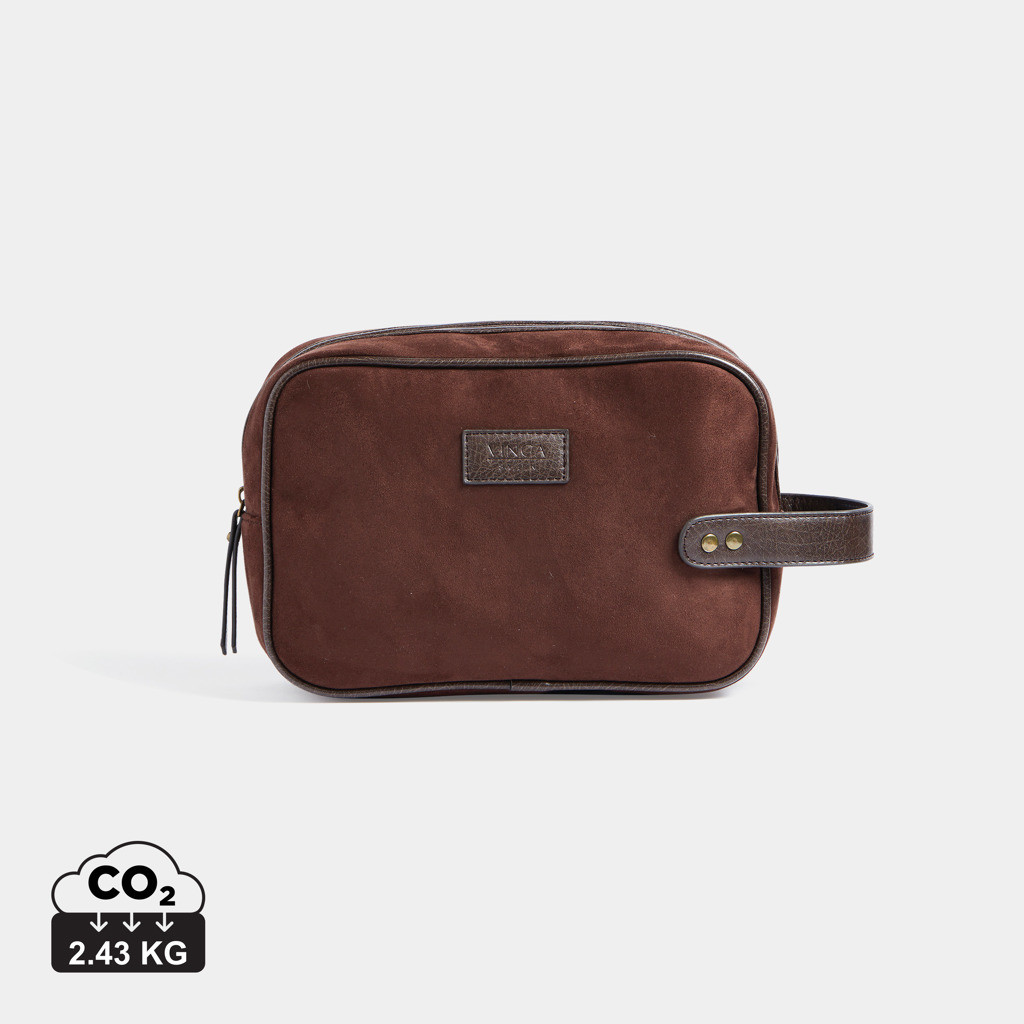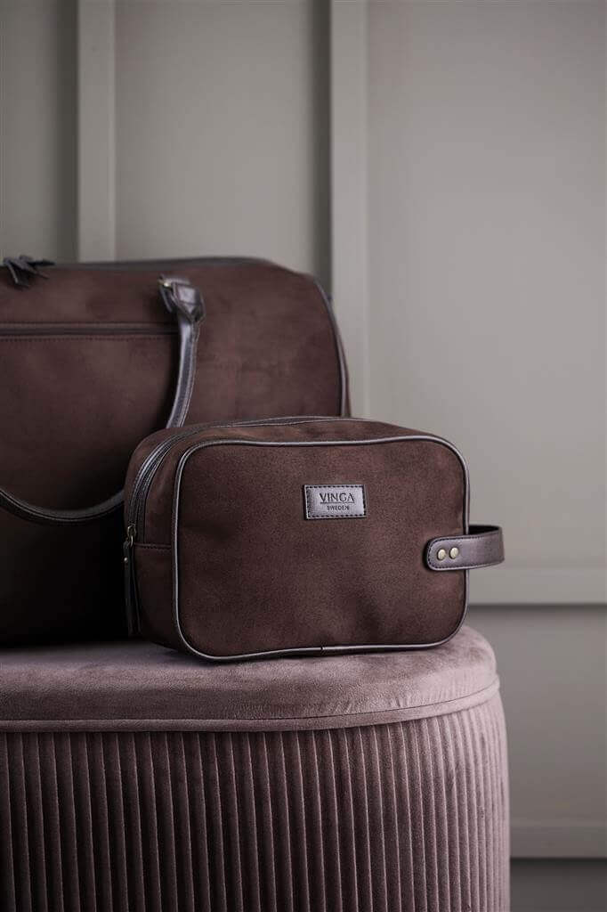 Klasická a zároveň moderní toaletní taštička v imitaci semiše s detaily z PU kůže. Umožní vám stylové uložení hygienických potřeb doma i na cestách. Má praktickou velikost a díky popruhu s mosaznými detaily na krátké straně se snadno nosí.
