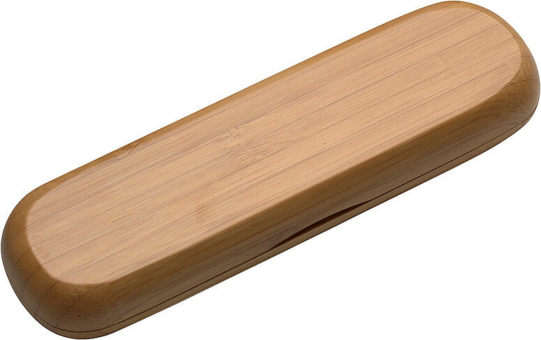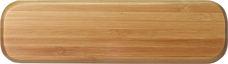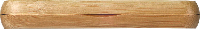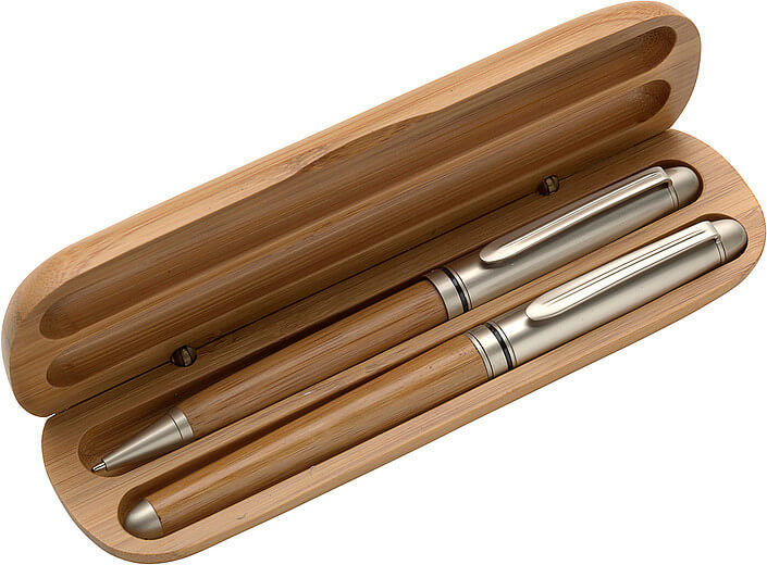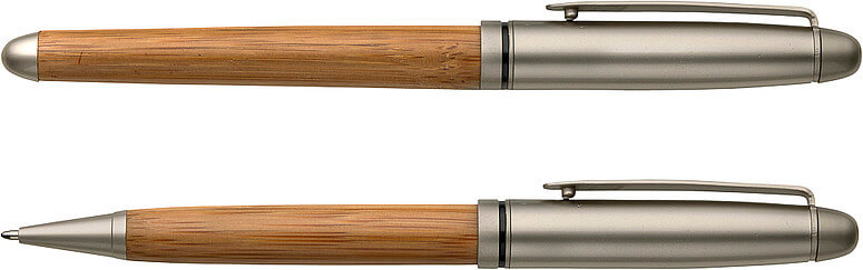 Bambusová psací sada, která se skládá z kuličkového pera a rolleru obojí s kovovými ozdobnými částmi a dodává se v odpovídajícím balení. Modrý inkoust.