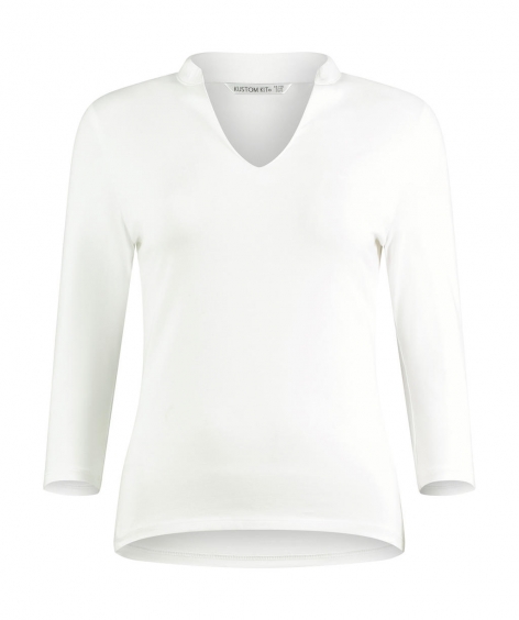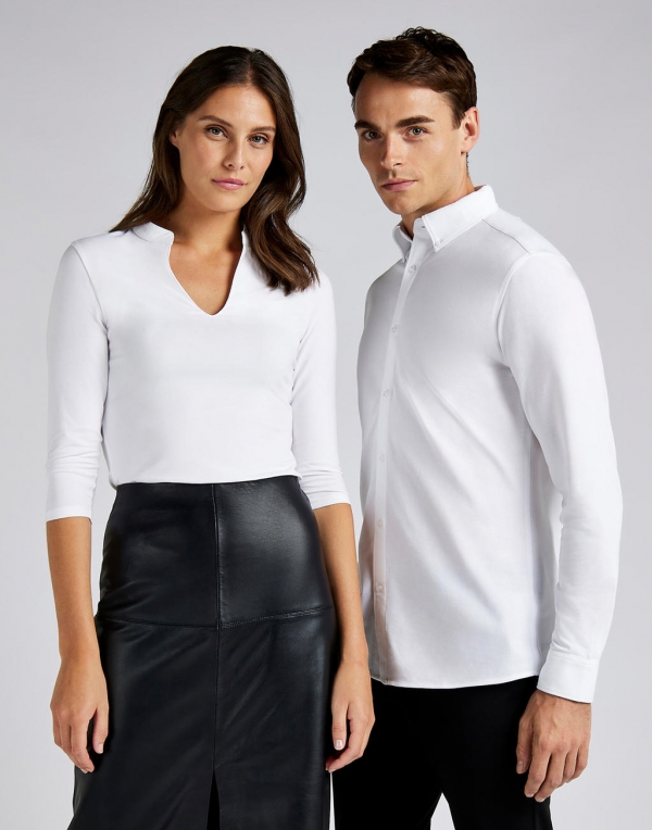 200 g/m², 95% bavlna, 5% elastan, elastanová tkanina pro lepší přizpůsobení, V-výstřih se stojatým límcem, ramenní švy podlepené vlastní tkaninou, 3/4 rukávy, dvojité švy na spodním lemu a manžetách, tvarovaný střih, boční švy, rovný spodní lem, běžný střih