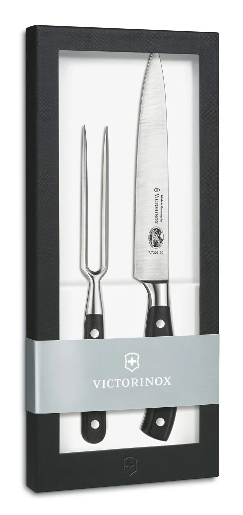 Tranžírovací souprava 2-dílná celokovaná s rukojeťmi vyrobenými z plastu zpracovávaného za velmi vysoké teploty. Souprava se skládá z kuchařského nože o délce čepele 20 cm a kuchyňské vidlice o délce 15 cm. Souprava obsahuje: 1. kuchařský nůž 7.7203.20 2. kuchyňská vidlice 7.7233.15