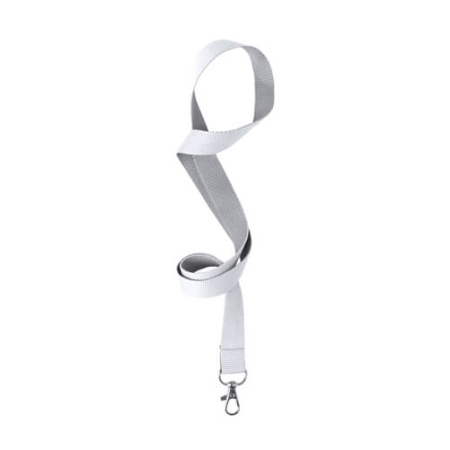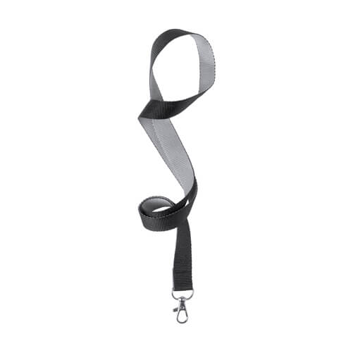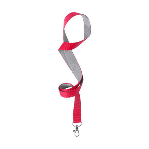 Dvoubarevný polyesterový lanyard s kovovou karabinkou.