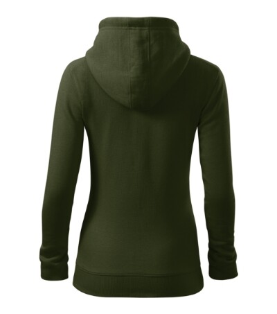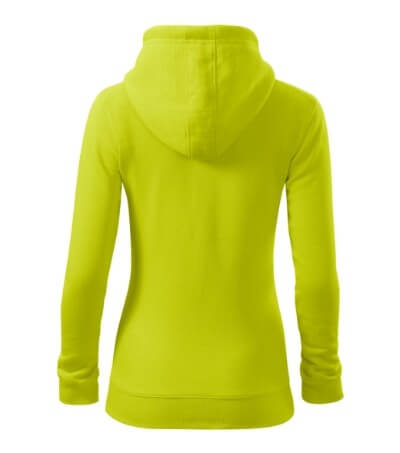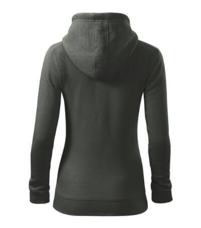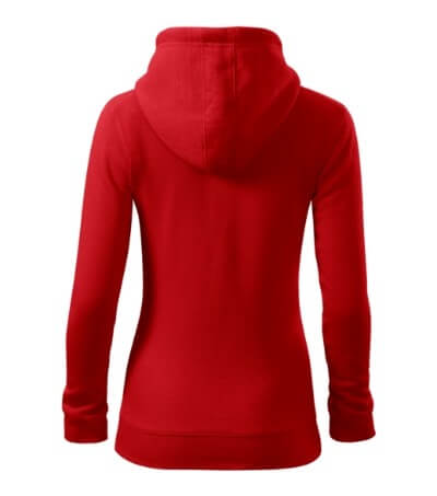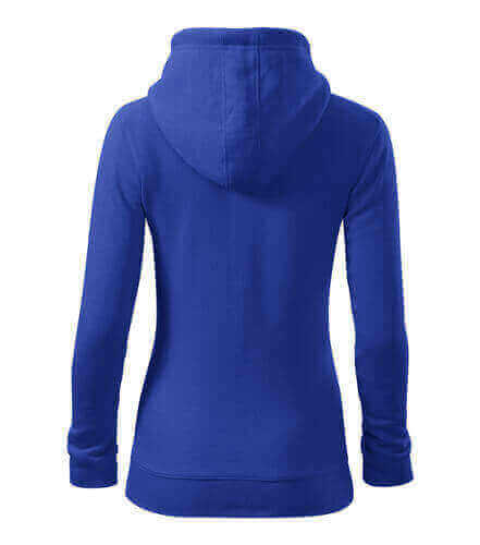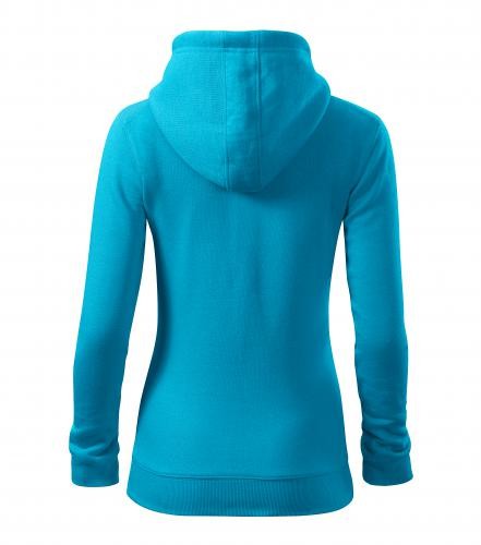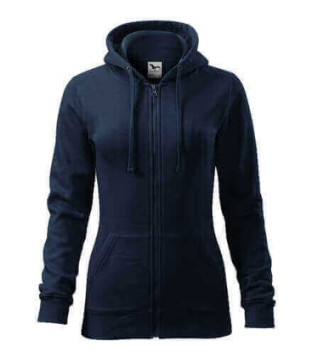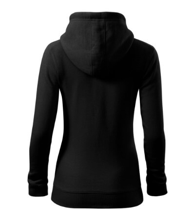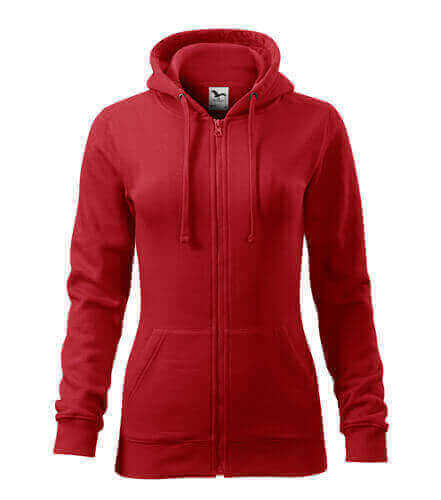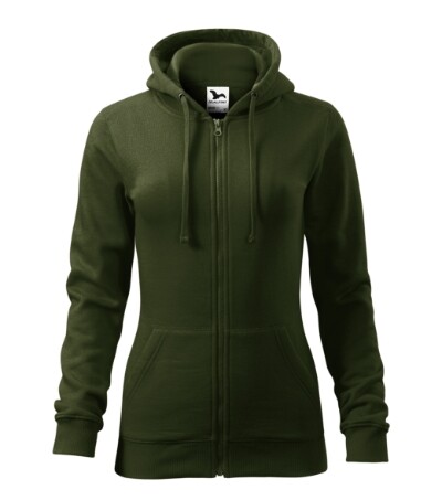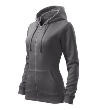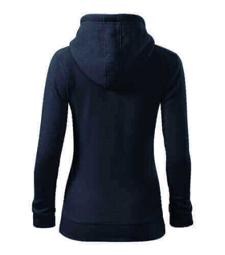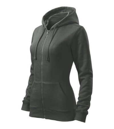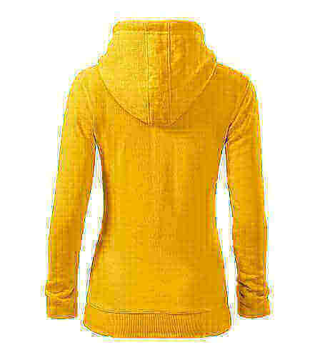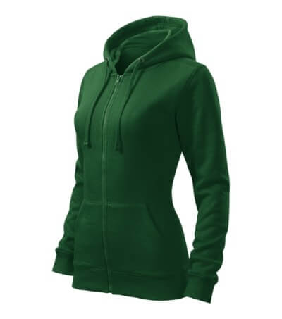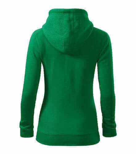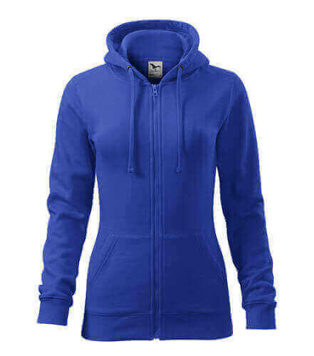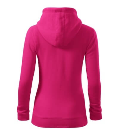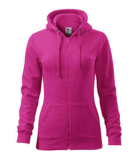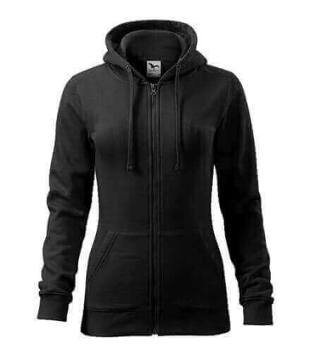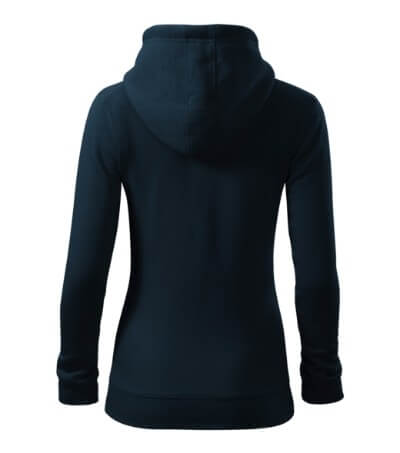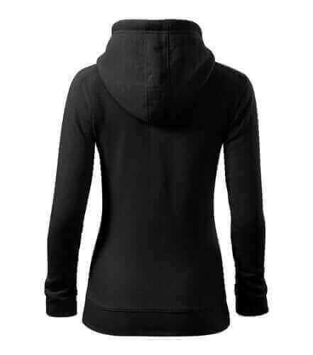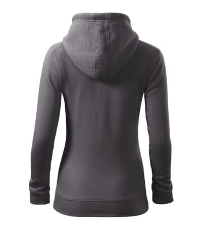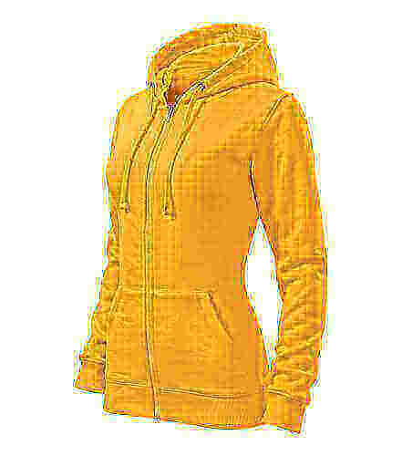 Dámská celozapínací mikina s kapucňou. Přední taška v štýle klokanky. Kapucňa s podšívkou, ke stažení šnúrkou. Vnútorná část priekrčníka je tvořena tkanou páskou vo farbe produktu. Sedlá a taška s dekoratívnym prešitím. Dolní okraj a rukávy zakončené rebrovými úplety 2: 2 s přísadou 5% elastanu. Vhodná na potlač a výšivku.