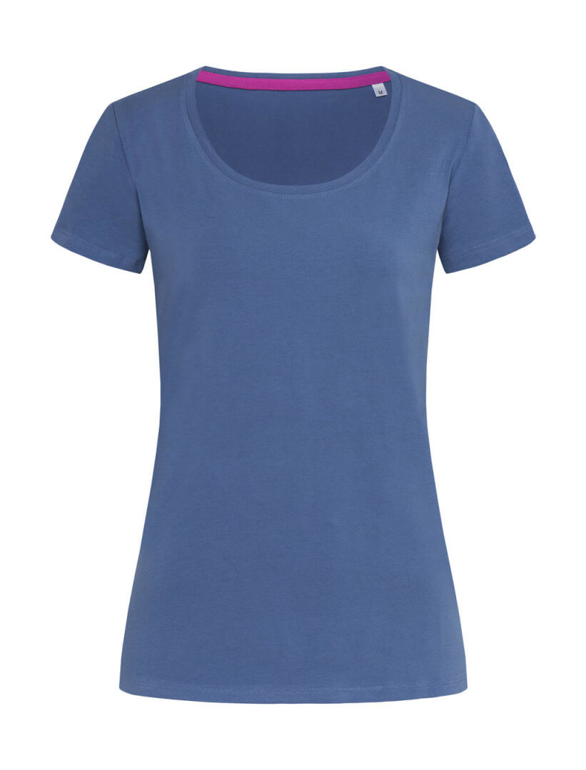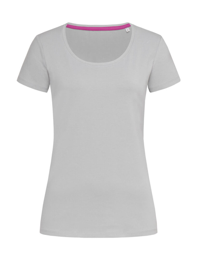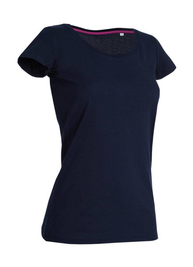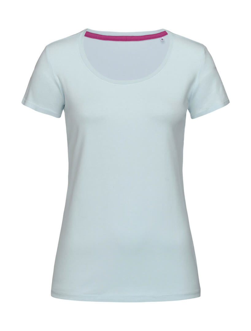 Moderní široký pokleslý výstřih · úzký žebrovaný límec · zpevňující pásek na krku v kontrastní barvě · zesílené švy na ramenou · úzký lem na rukávech · boční švy · tvarovaný střih