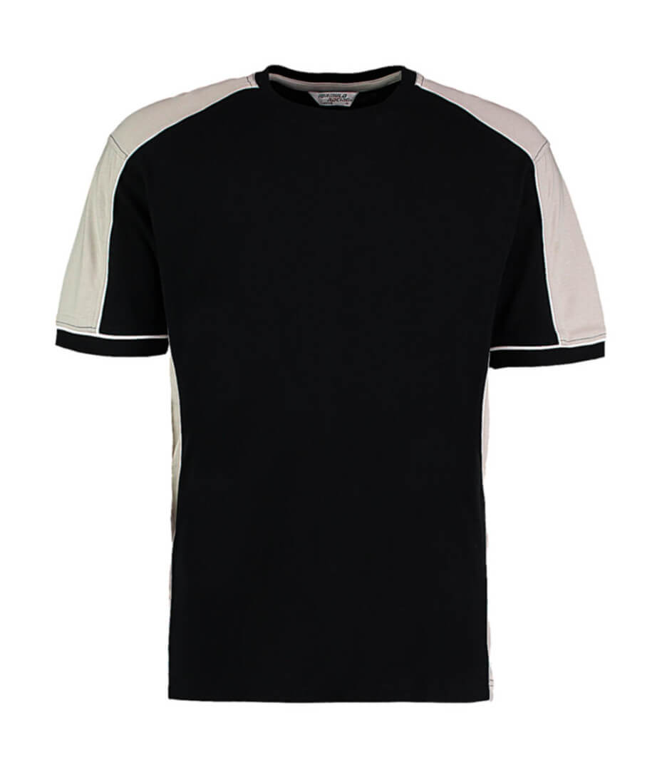 · Žebrovaný lem u krku a na rukávech · týlní pás v kontrastní barvě · široké kontrastní pruhy přes ramena, rukávy a po stranách · bílý lem mezi kontrastními barvami · tkaný štítek