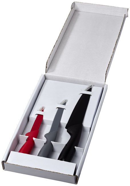 Třídílná sada nožů Main. Třídílná sada nožů obsahuje šéfkuchařský nůž, nůž s ozubenou čepelí a kuchyňský nůž. Čepele mají nelepivý povrch, díky němuž nakrájené přísady snadno sklouznou z nože. Prezentováno v dárkovém balení Avenue. Nerezová ocel a plast.