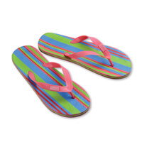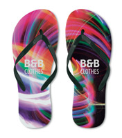 Plážové pantofle ve vybrané barvě. Třívrstvé s PVC páskem. Hladký povrch, páskový vzor na spodní podrážce (tloušťka 15 mm). Na pantofle je možný fotografický potisk nebo sítotisk. PVC štítek na obou popruzích za příplatek. Na podrážce lze vyrazit nápisy nebo logo vaše firmy.