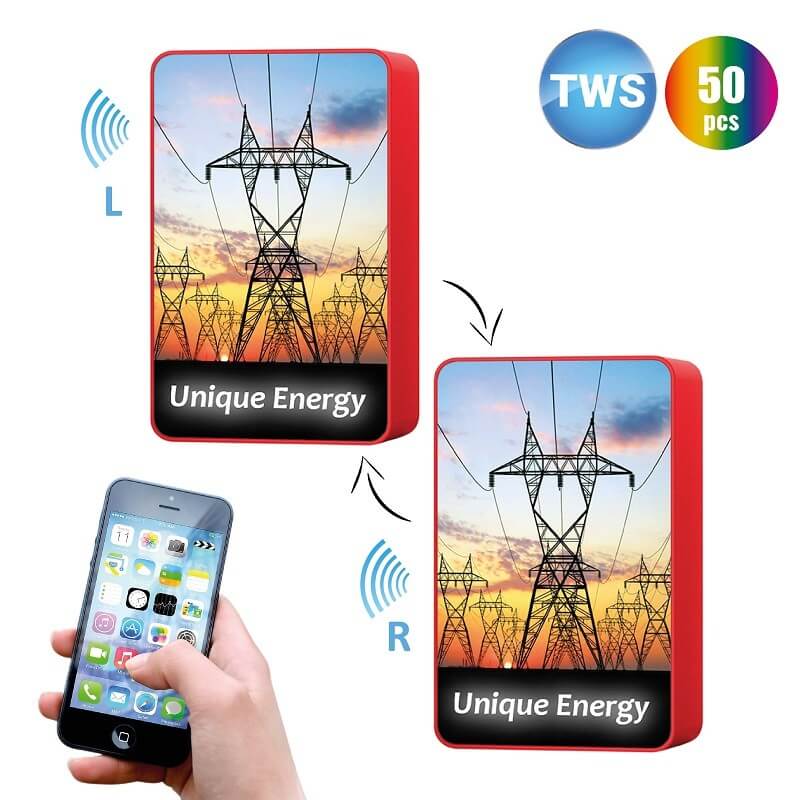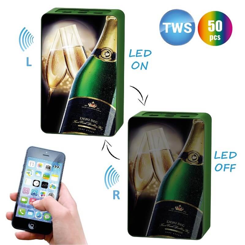 Milovníci kvalitní hudby a poslechu v opravdu vyladěné stereo kvalitě jistě velmi ocení tento TWS set dvou Bluetooth reproduktorů. Součástí setu jsou rovnou 2 promakané bezdrátové reproduktory, které se dají připojit najednou a s pomocí funkce TWS (True Wireless Stereo) vytvoří perfektní stereo poslech. Reproduktory jsou bezdrátově připojeny pomocí technologie Bluetooth 4.0 s dosahem až 10 metrů. Uvnitř každého kusu navíc nechybí basový a výškový reproduktor. Bezdrátové Bluetooth reproduktory je možné opatřit libovolným celoplošným barevným CMYK potiskem či vlastním logem, které nádherně vynikne díky LED podsvícení. To lze ještě doplnit plastovým rámečkem vyrobeným ve vlastní Pantone barvě (s dostupností již od 50 ks). Oblíbená je rovněž varianta dvou různých grafik na dva reproduktory. Zabalena v krásné akrylové krabičce vznikne jedinečná a funkční sada, která v každém zanechá hluboký dojem.
