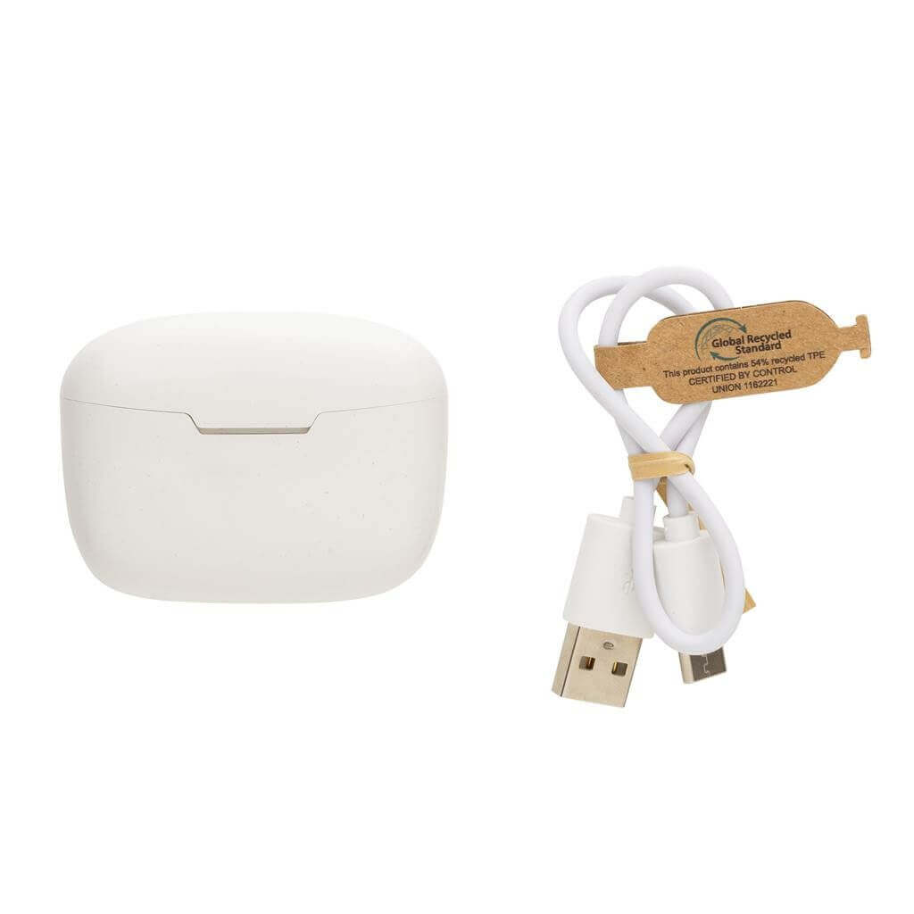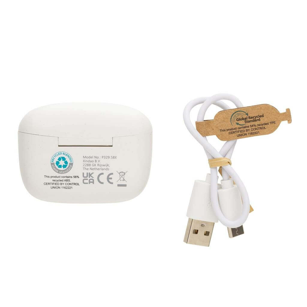 Další generace skutečně bezdrátových sluchátek v nabíjecí krabičce. Vyrobené z RCS recyklovaného ABS plastu. RCS (Recycled Claim Standard) je globální standard, který umožňuje ověřit použití recyklovaného materiálu v produktu napříč celým dodavatelským řetězcem. Celkový podíl recyklátu dle váhy produktu: 56 %.Skvěle padnoucí sluchátka s kapacitou 35 mAh pro poslech po dobu až 3h na střední hlasitost. Nabíjecí krabička s kapacitou 300 mAh sluchátka plně dobije již za 1,5h. BT 5.3 zajišťuje snadné automatické párování a stabilní bezdrátové spojení na vzdálenost až 10m. Mikrofon pro možnost telefonování ve stereo režimu, dotykové tlačítko pro příjem hovorů nebo pozastavení hudby. Včetně 3 extra párů nástavců do uší v různých velikostech a nabíjecího kabelu z GRS TPE. Baleno v FSC® kraftové dárkové krabičce. 3 baterií typu Li-poly súčasťou balenia.