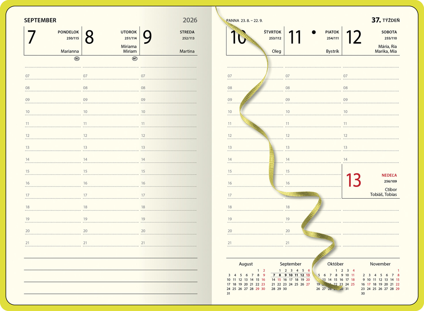 Stylový týdenní diář v černé barvě s přehledným kalendáriem na celý týden. Diář má praktickou flexi vazbu. Uprostřed diáře je gumička připevněná ke kovovému držátku. Obsahuje slovenský kalendář.