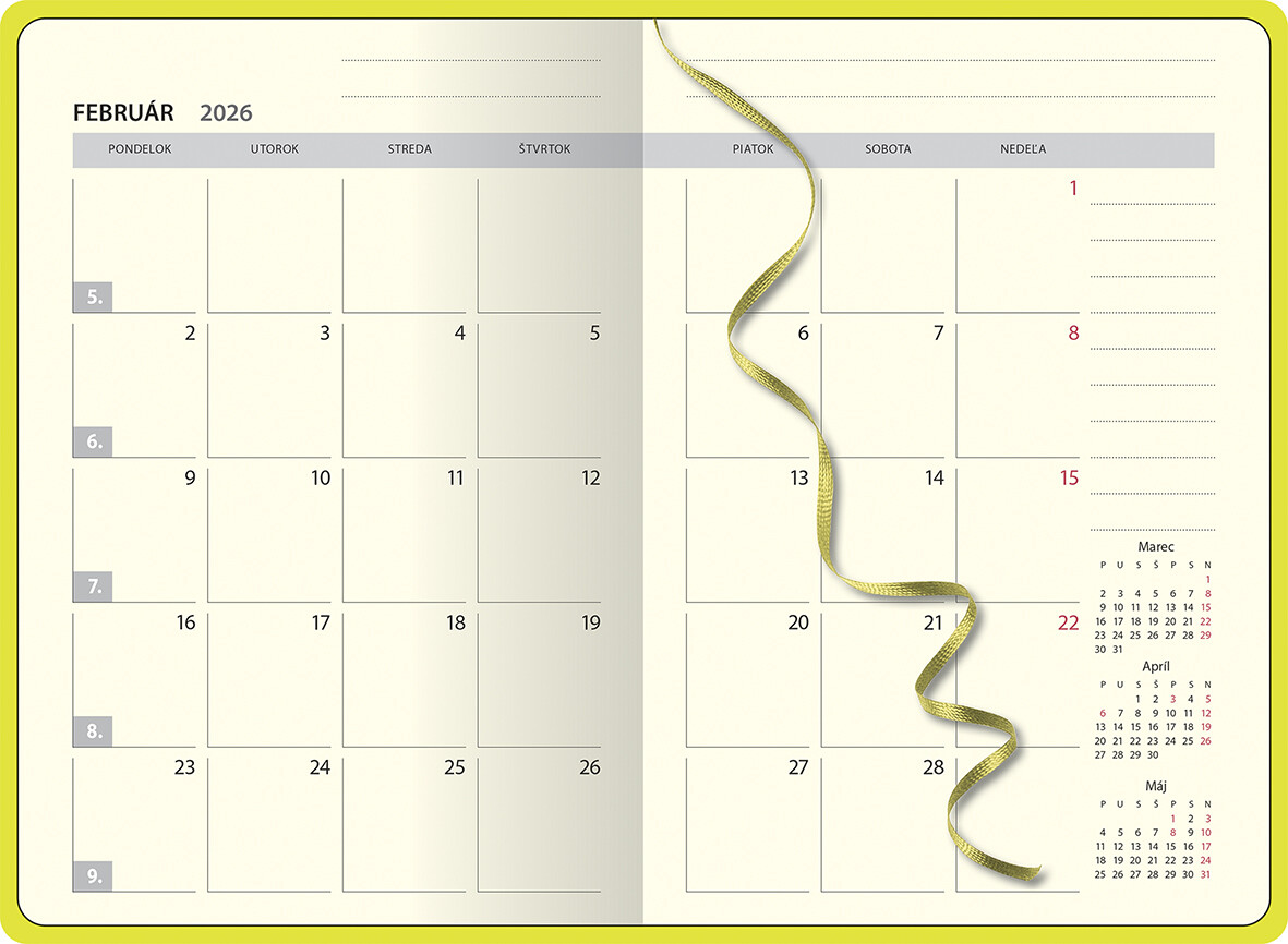 Stylový týdenní diář v oranžové barvě s přehledným kalendáriem na celý týden. Diář má praktickou flexi vazbu. Uprostřed diáře je gumička připevněná ke kovovému držátku. Součástí je slovenský kalendář.