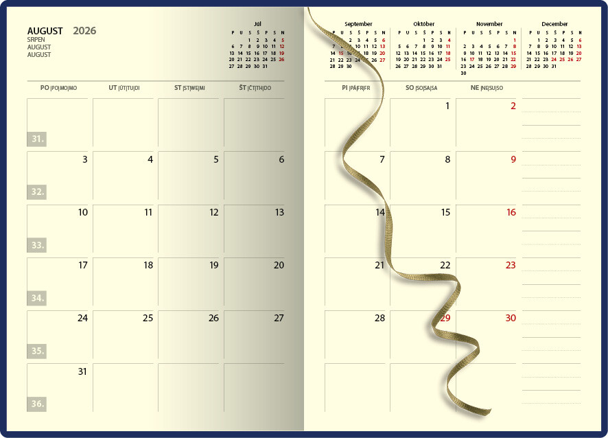 Oblíbený týdenní diář s přehledným kalendáriem na celý týden. Diář je v pevné vazbě s přední pěnovou stranou se slovenským kalendáriem. Jednoduchý design doplňuje stříbrná ražba letopočtu.
