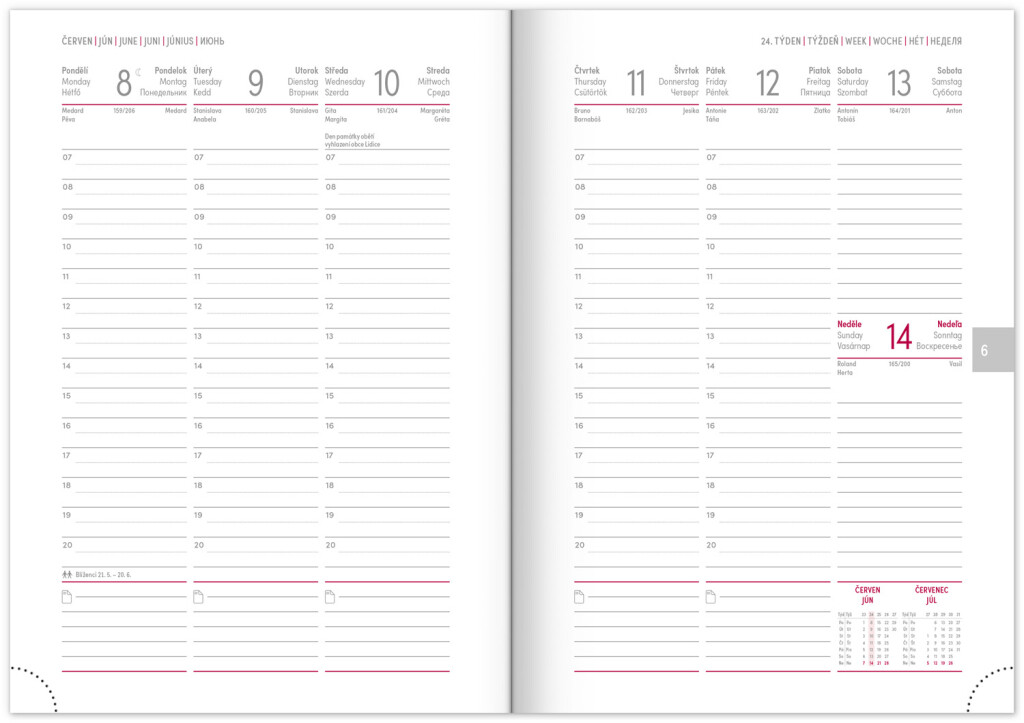 Týdenní rozvrh s československým kalendářiem a doplňkovou angličtinou, němčinou, maďarštinou a ruštinou.