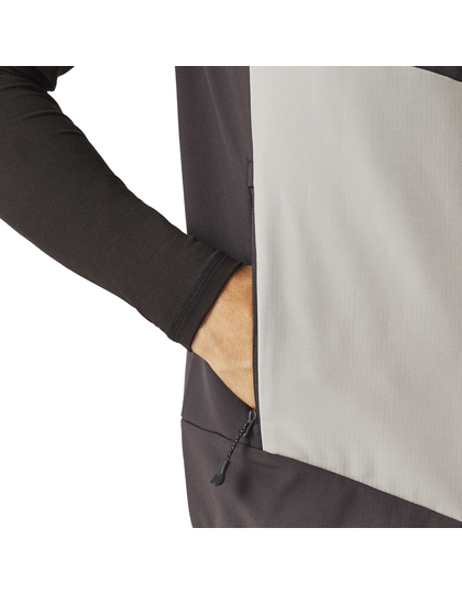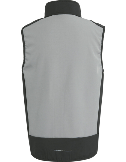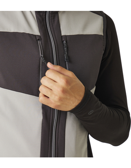 Tkaný strečový softshellový materiál s hřejivou vrstvou. Tkanina s ochranou proti větru a vodě. Pružné lemování na průramcích, lemu a límci. 2 spodní kapsy na zip a 2 náprsní kapsy na zip s vnitřním chráničem zipu. Reflexní natištěný detail. Na hrudi místo na dekoraci. Vyrobeno z recyklovaných materiálů.