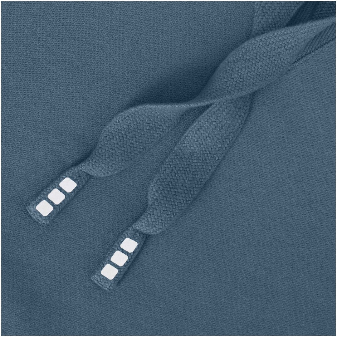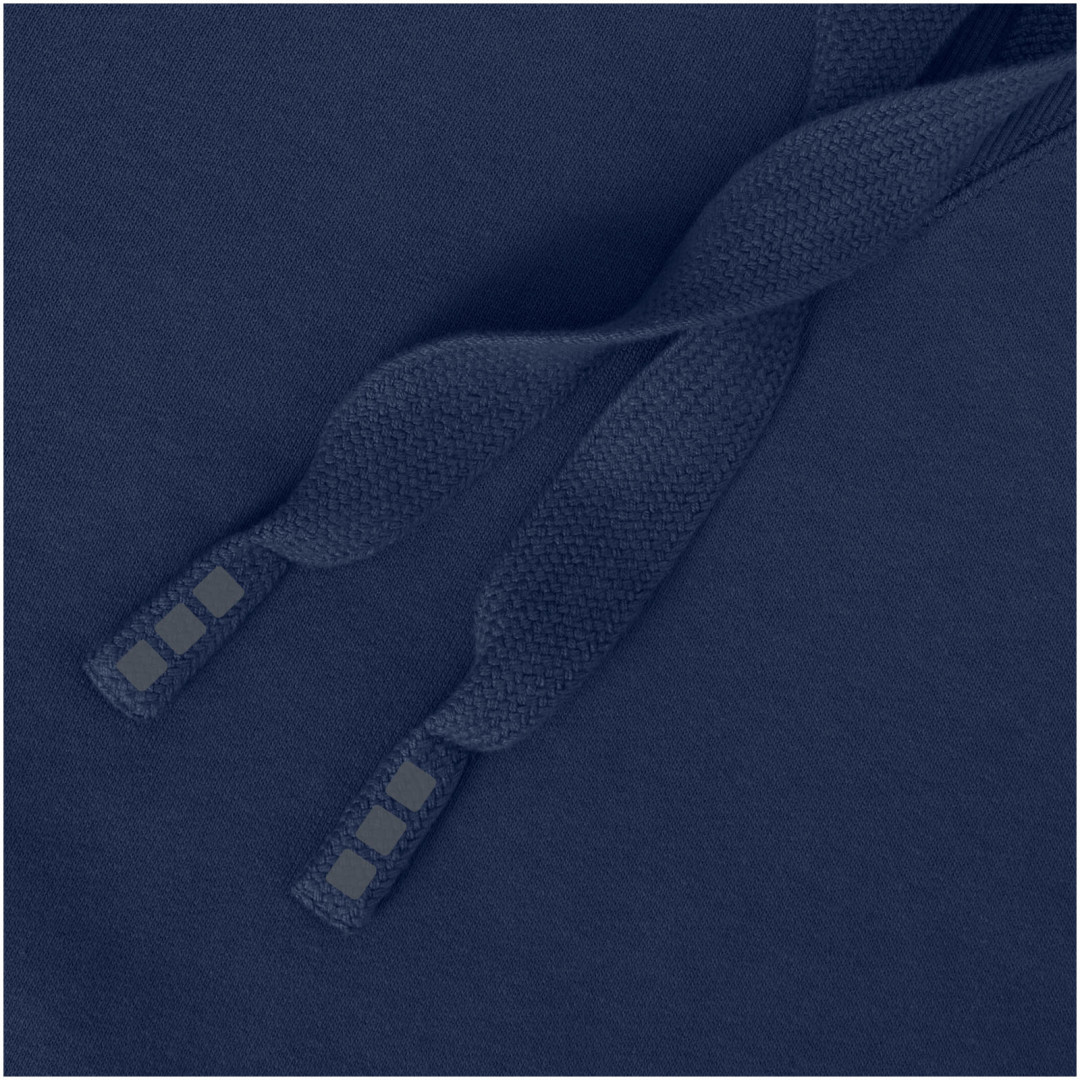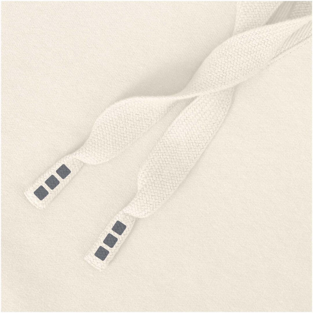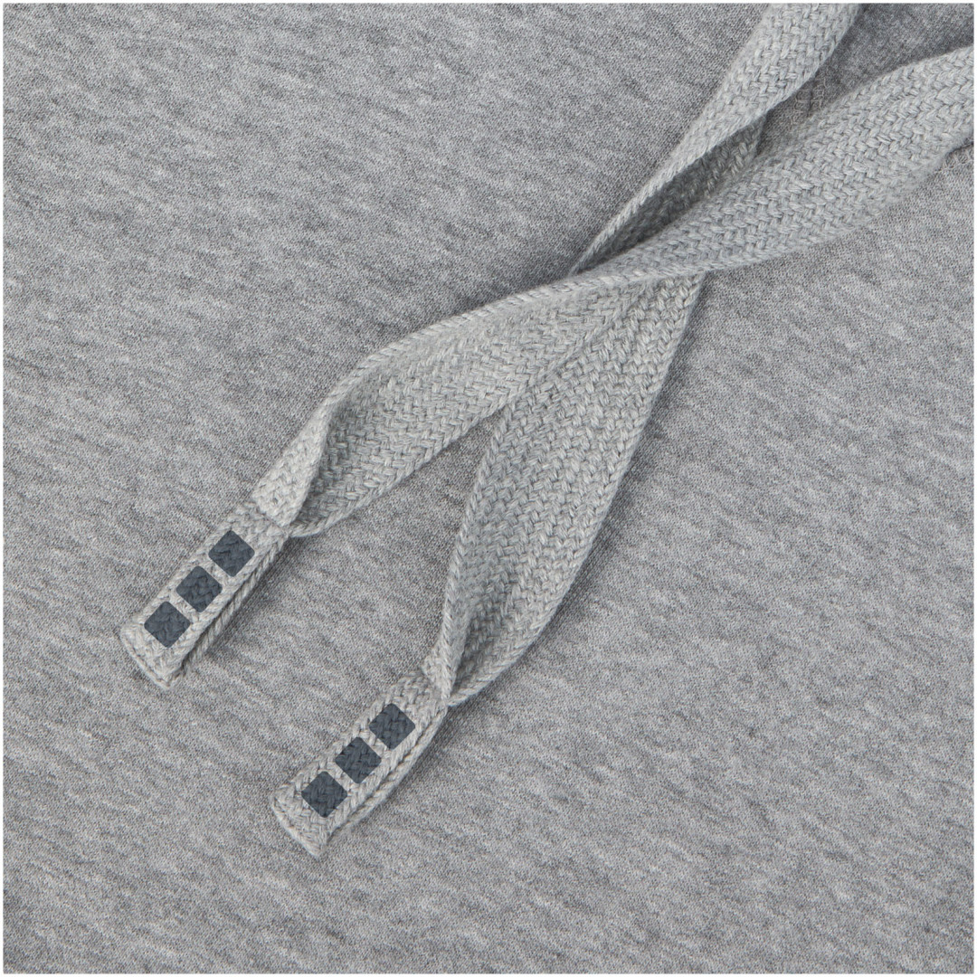Žebrový úplet bočních panelů Žebrový úplet v-vkládek vpředu na středu. Ploché žebrované manžety ve tvaru V. Žebrový úplet spodního lemu. Stahovací šňůrka v kapuci. Klokaní kapsa. Sedlo. Podšívka z jednolícní pleteniny (žerzej) uvnitř kapuce. Gravírovaná postříbřená očka. Saténová lemovka výstřihu. Páska ve tvaru rybí kosti v kontrastní barvě. Vnitřní kartáčovaná strana zajišťuje měkký, hřejivý a pohodlný pocit.