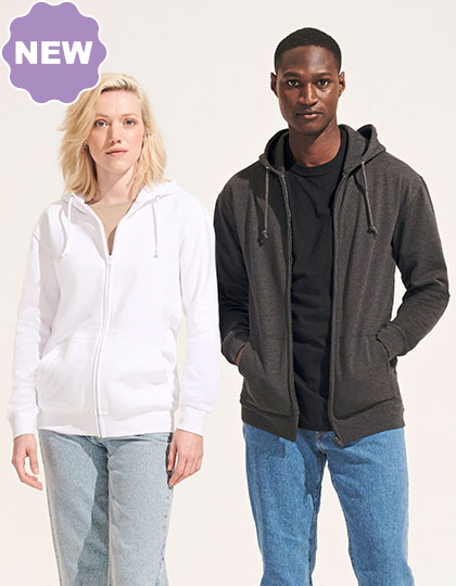 Recyklovaný polyester. Vsazené rukávy. Postranní švy. 1x1 žebrované manžety a spodní část. Kapsa klokanka. Podšitá kapuce se stahovací šňůrkou ve stejné barvě a s kovovými očky. Přední zapínání se skrytým zipem. Sladěný plastový zip se sladěným kovovým jezdcem. Žerzejový půlměsíc a zpevňovací páska za krkem uvnitř límce.