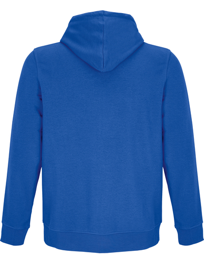 Česaná organická bavlna od pěstitelů přecházejících na organickou výrobu. Recyklovaný polyester. Postranní švy. Vsazené rukávy. 2 x 2 žebrované manžety a spodní část. Kapsa klokanka. Kapuce lemovaná žerzejem. Stahovací šňůrka s kovovými očky a zarážkami. Přední zapínání se skrytým zipem. Kovový zip a stahovák. Žerzejový půlměsíc a zpevňovací páska za krkem uvnitř límce. Nečesaná vnitřní strana.