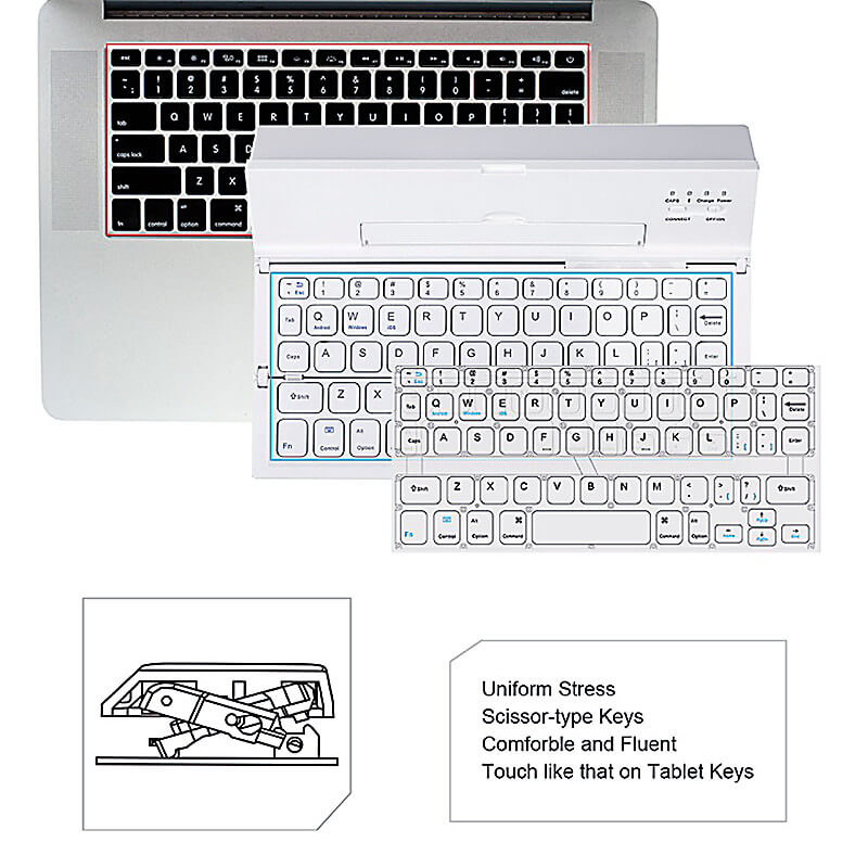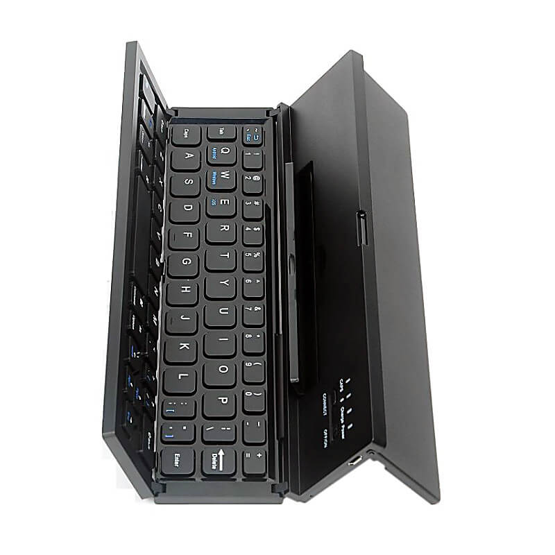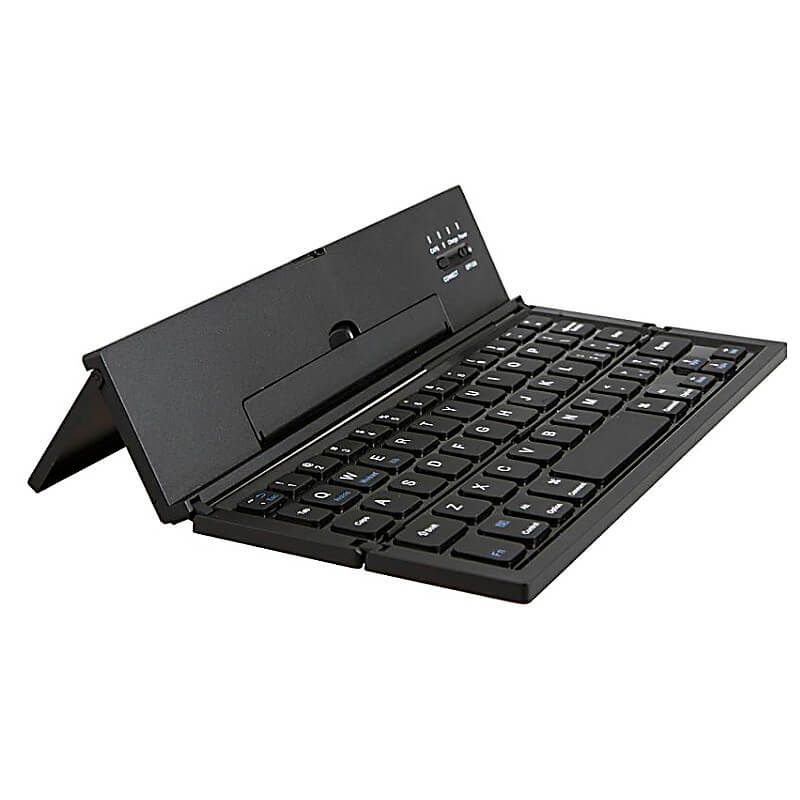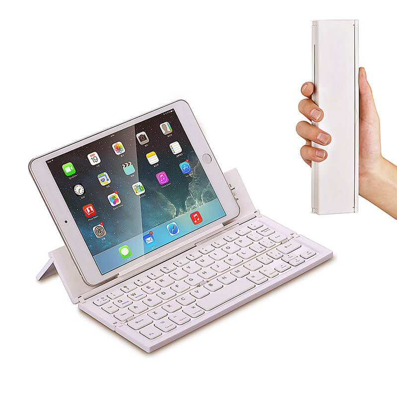 Univerzální skládací Bluetooth klávesnice je ideální pro připojení k tabletu či mobilního telefonu. Tenkou klávesnici připojíte ke svému zařízení pomocí technologie Bluetooth je kompatibilní s iOS, Androidem i Windows. Dosah připojení je až 10 metrů. Praktickým složením získáte malou pomůcku pro kancelářskou práci, která se vejde do příručního zavazadla. Po rozložení se dá klávesnice příjemně využívat díky vzniklému stojánku pro opření mobilního zařízení. Skládací Bluetooth klávesnice je vyrobena z plastu. Zvolit si můžete z různých barev a k dispozici je možnost potisku.