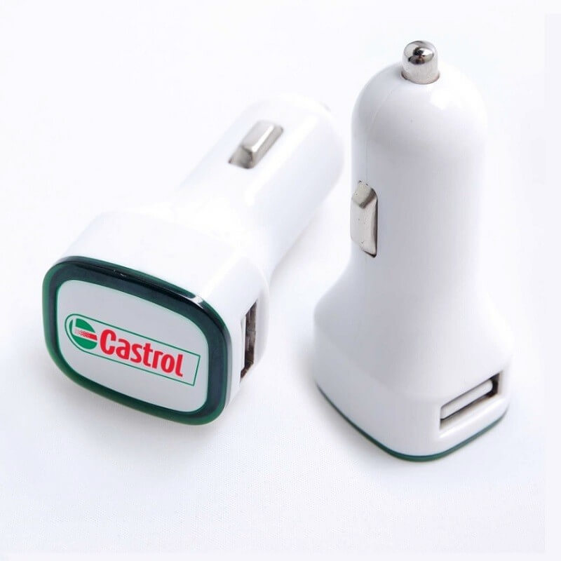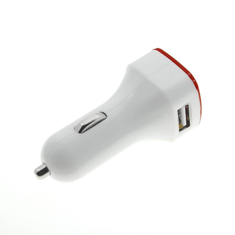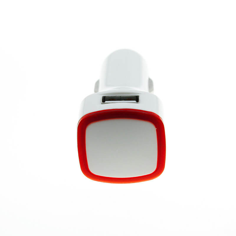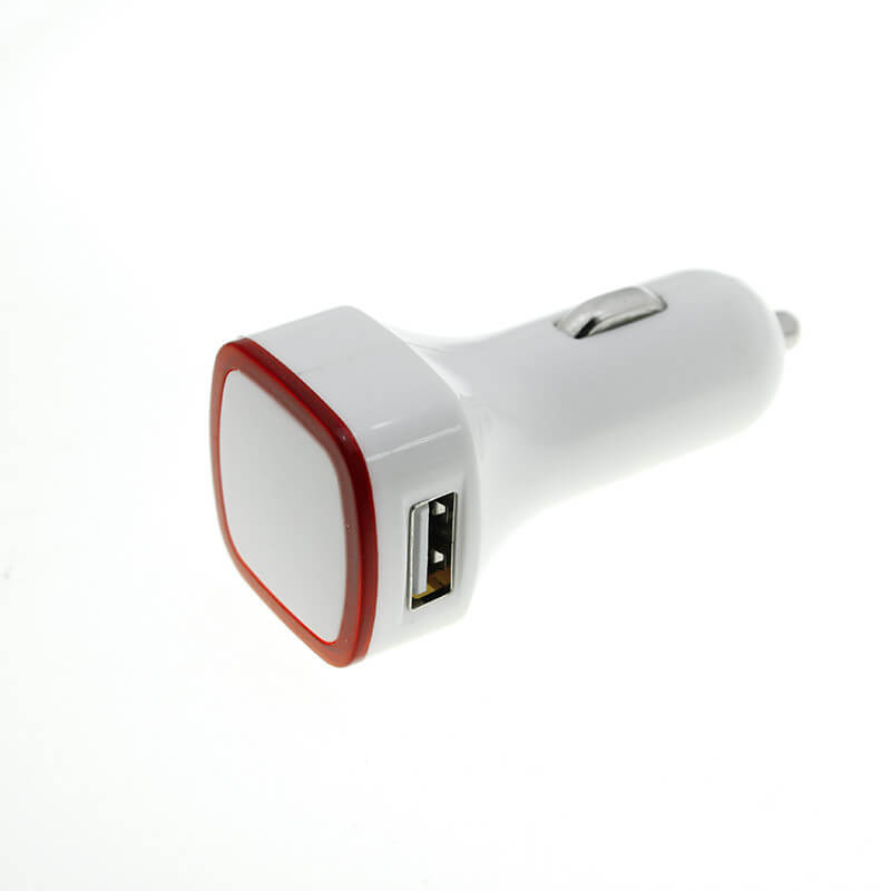 USB Duál auto nabíječka (USB adapter do autozapalovače). Vhodný pro reklamní potisk logem. Nabíjí iPod a iPhone, Smartphone, ipad, ipad2 či Tablet, apod. Má duální USB port (2 postranní USB výstupy 2,1A + 1A). LED rámeček skvěle zvýrazní vaše logo, může být v různých barvách.
