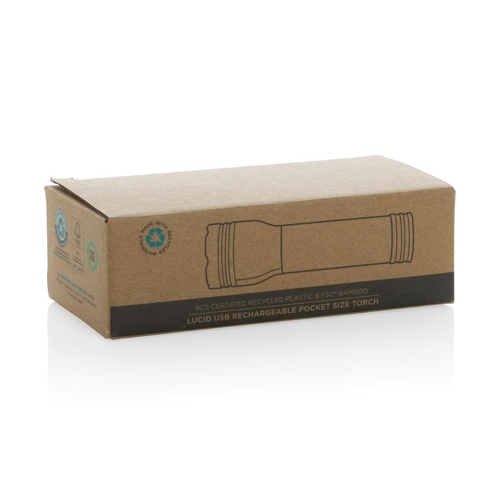 USB dobíjitelná 1 W svítilna vyrobená z RCS recyklovaného ABS a 100 % FSC® bambusu. RCS (Recycled Claim Standard) je globální standard, který umožňuje ověřit použití recyklovaného materiálu v produktu napříč celým dodavatelským řetězcem. Celkový podíl recyklátu dle váhy produktu: 23 %. Výkonná žárovka se svítivostí 90 lumenů a dosvitem až 50 m. 3 módy světla (silné, střední, blikající). Integrovaná baterie s kapacitou 500 mAh umožňuje opakované dobíjení jednoduše skrze USB port a pužívání až 3h na jedno nabití. Plné nabití již za 2,5h. Včetně USB C nabíjecího kabelu z RCS recyklovaného TPE. Produkt i balení bez PVC. Baleno v FSC kraftovém dárkovém balení. 1 baterií typu Rechargeable v balení.
