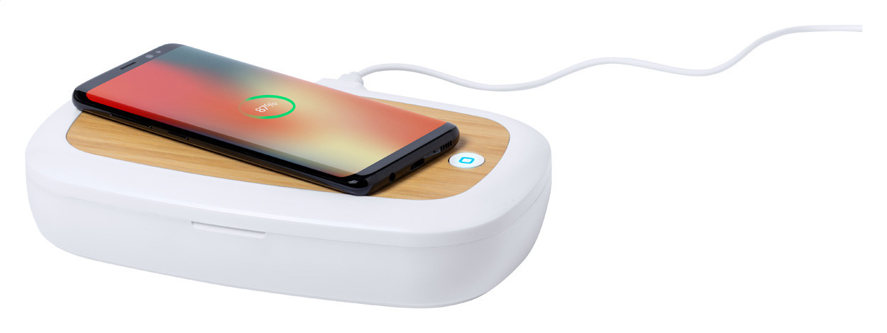 Sterilizační box UV-C s bezdrátovou nabíječkou pokrytou bambusem. Ideální pro sterilizaci smartphonů, klíčů nebo brýlí. Doba sterilizace s funkcí automatického vypnutí 5 a 10 minut. Max. výstup: 1000 mA. Včetně USB nabíjecího kabelu.