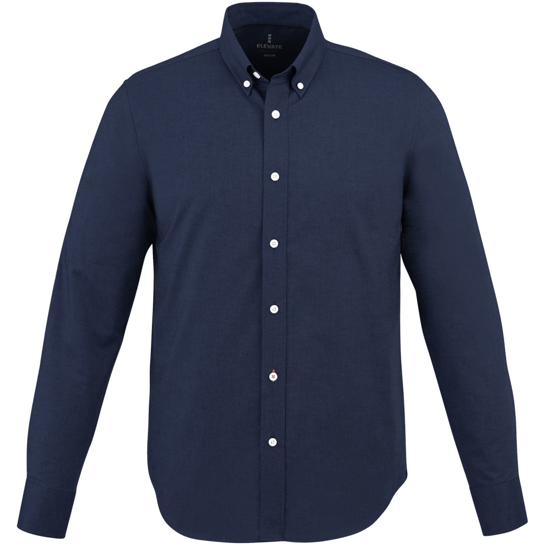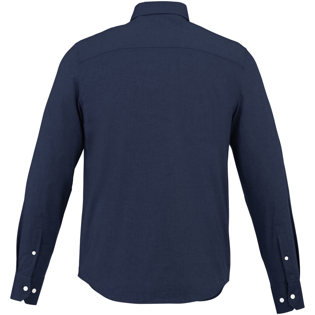 Límeček na knoflíčky. Nastavitelná manžeta s jedním záhybem. Druhá knoflíková dírka od spodního lemu s oranžovým stehováním. Saténové lemování vnitřního výstřihu. Gravírované perleťové knoflíčky. Potisk štítku technologií heat transfer pro větší pohodlí.