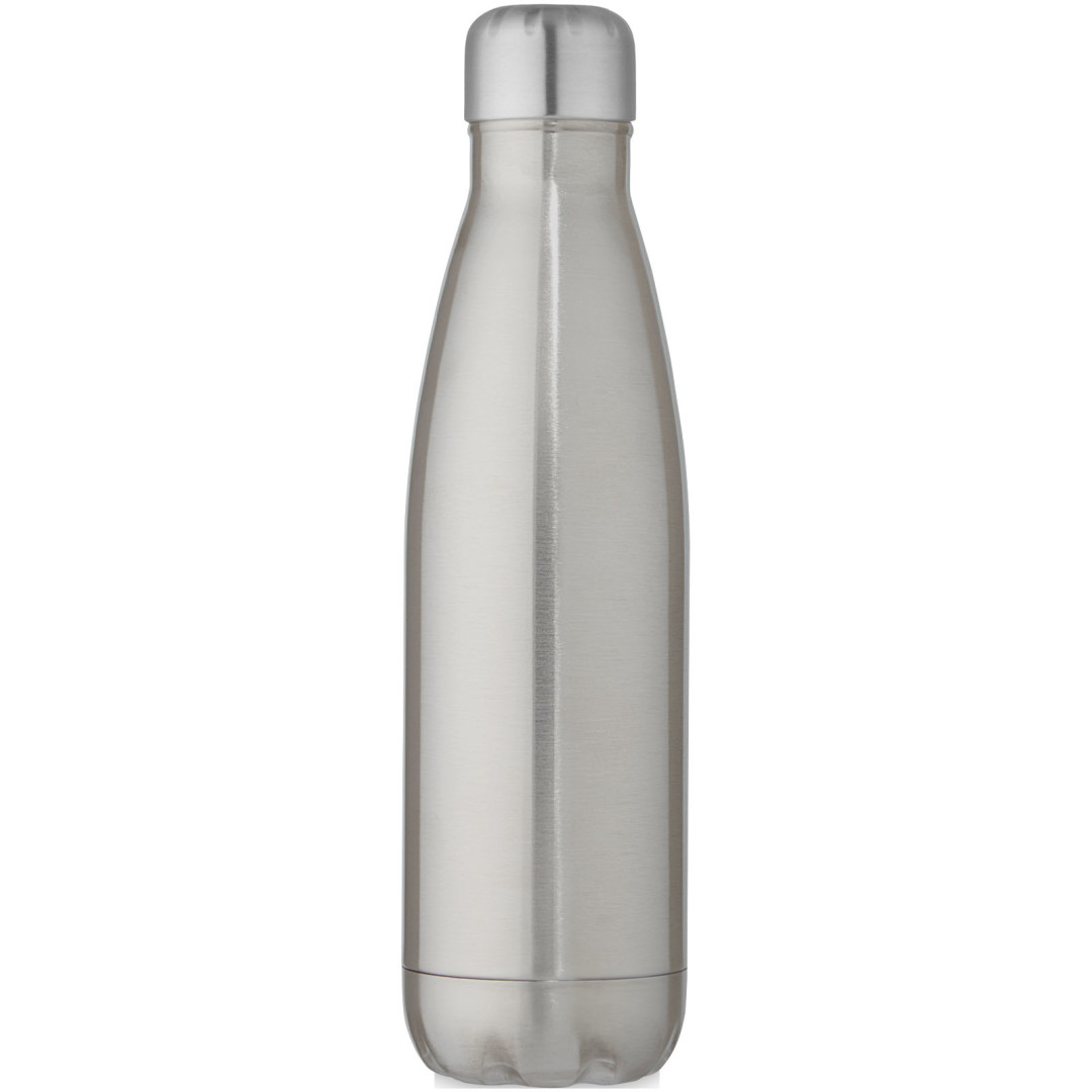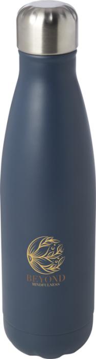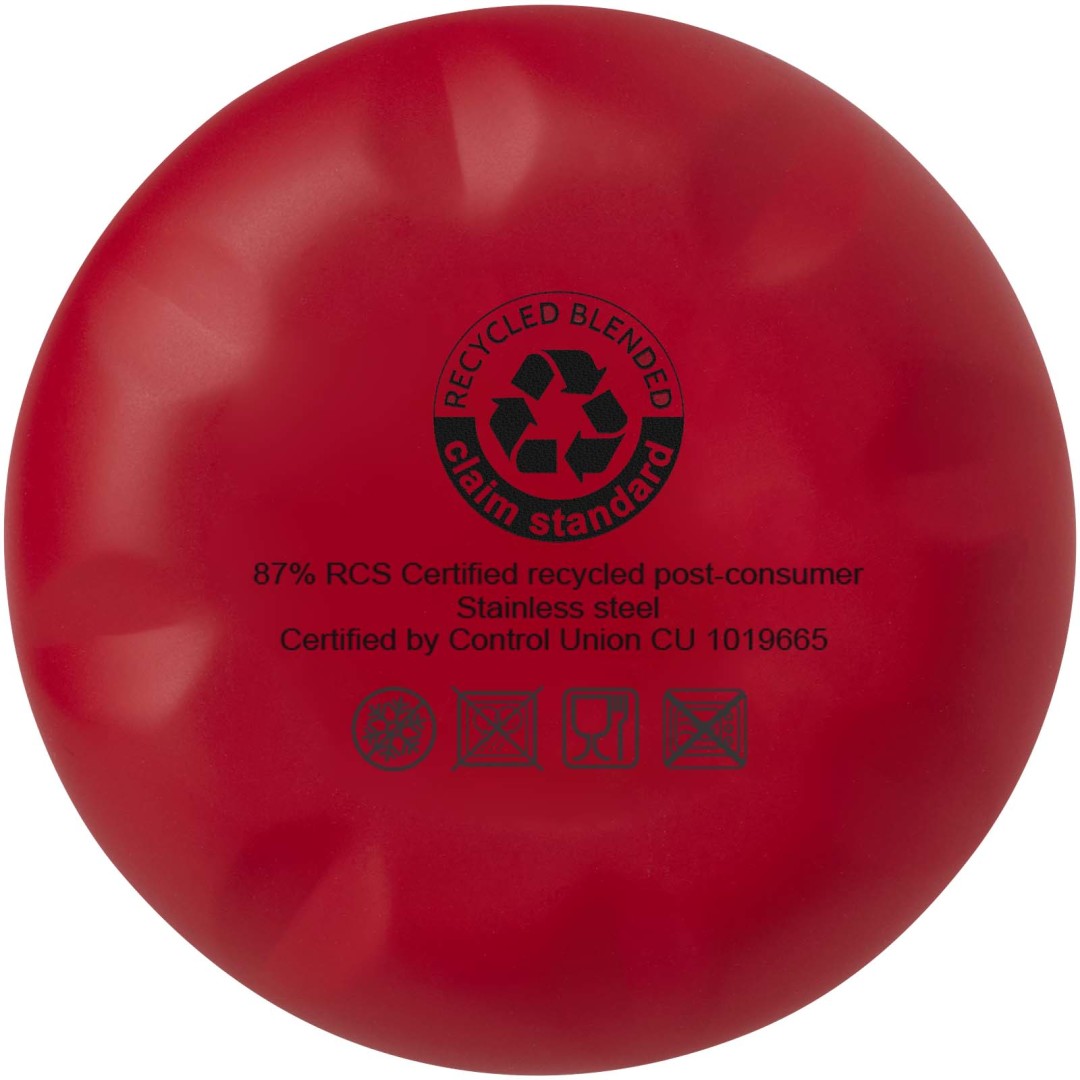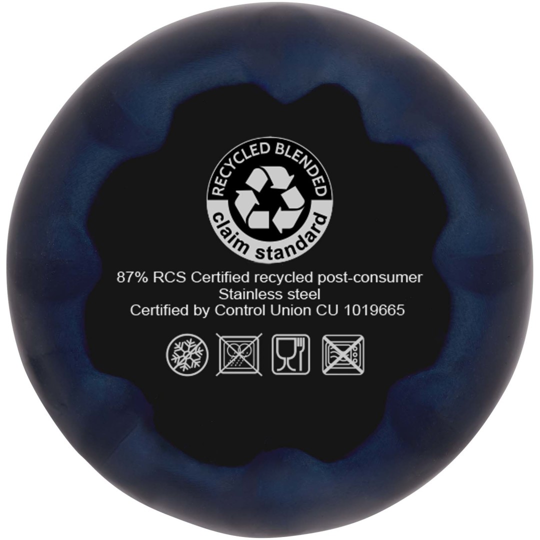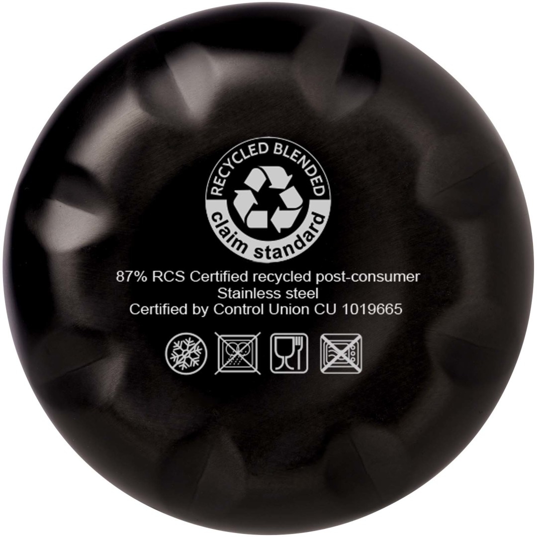 Vakuově izolovaná láhev z recyklované nerezové oceli s certifikací RCS s ikonickým designem, která udrží nápoje horké nebo studené po několik hodin. Díky základně, která se vejde do většiny držáků nápojů, je tato elegantní láhev na vodu perfektním reklamním předmětem. Testováno a schváleno podle německé legislativy pro bezpečnost potravin (LFGB), testováno na obsah ftalátů podle předpisů REACH. Objem je 500 ml. Dodává se v dárkové krabičce z recyklované lepenky.