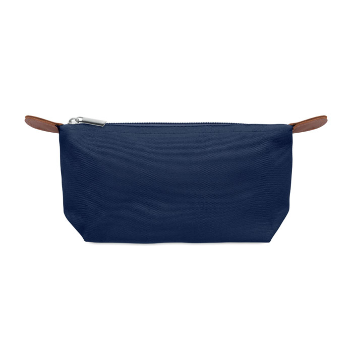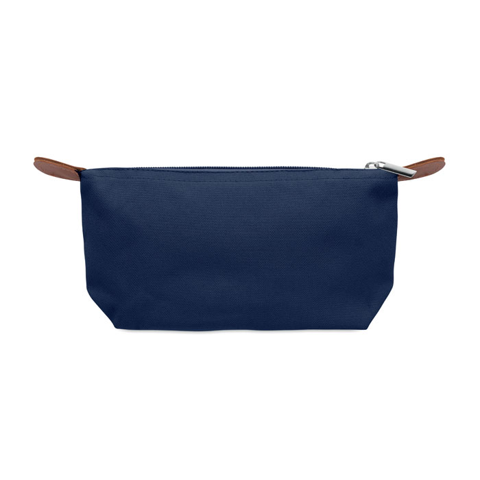 Kosmetická taštička z polyesteru 600D RPET s horním zapínáním na zip a hnědým PU detailem.