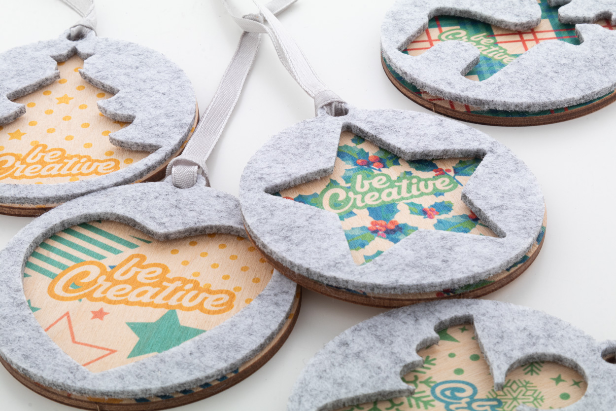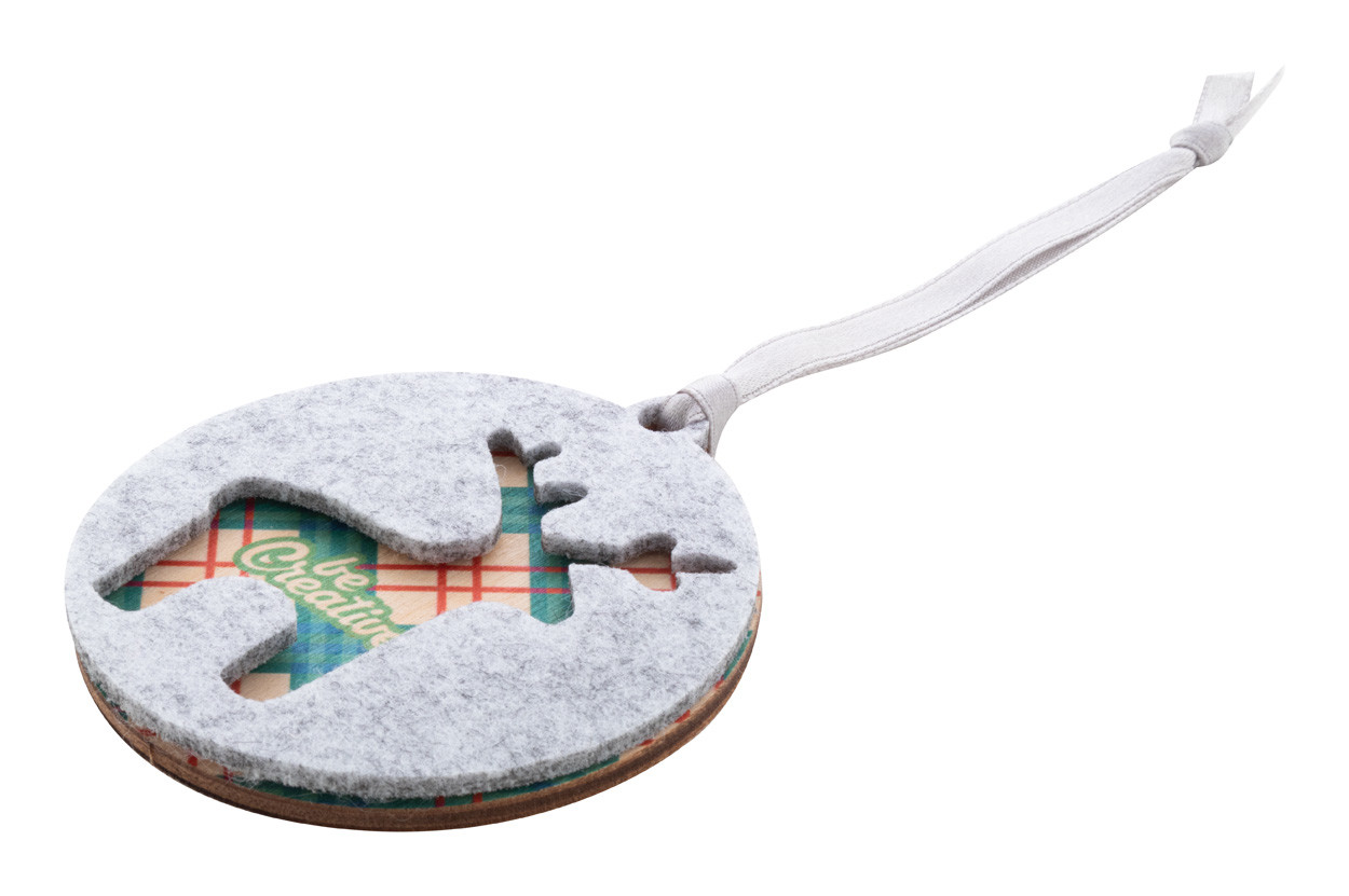 Ozdoba na vánoční stromek z dvouvrstvé RPET plsti a březové překližky vyrobená na zakázku s celostříbrnou stuhou a vysekávaným vánočním designem na horní vrstvě. Cena zahrnuje UV LED potisk na spodní vrstvě, nezahrnuje tiskovou přípravu. Min. mn.: 100 ks.