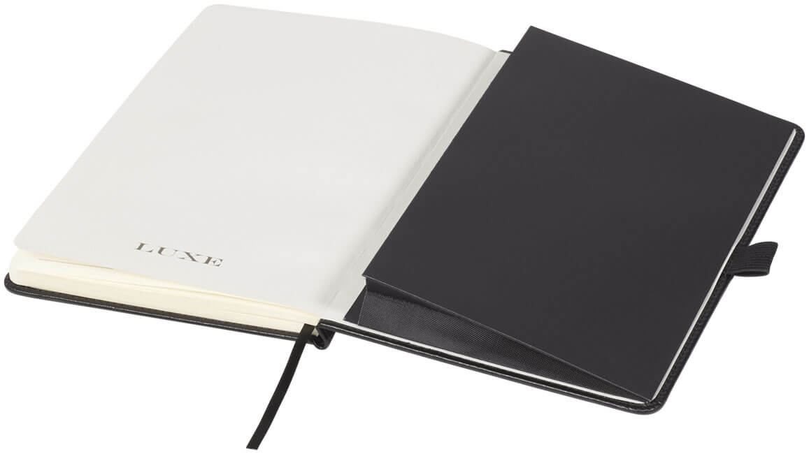 Exkluzivní designový zápisník (velikost A5) s gramáží 80 g/m2, 80 listů krémového papíru s vnitřní zadní kapsou a smyčkou na pero. Zabaleno v dárkové krabičce "LUXE". Imitace kůže.