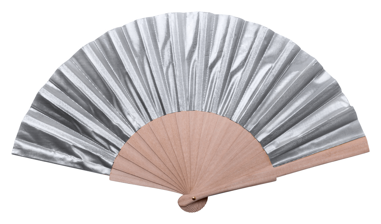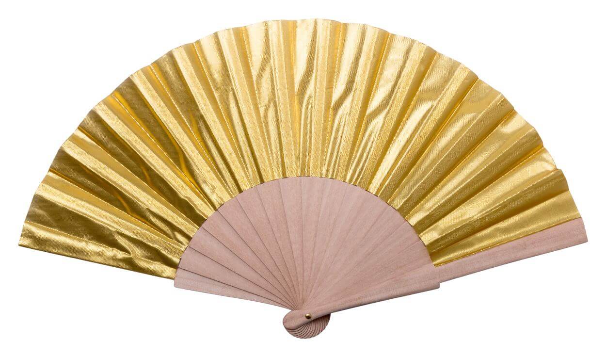 Skládací vějíř s dřevěnými žebry a metalickým pásem.