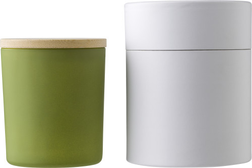 Sklenice se svíčkou z rostlinného vosku s bambusovým víčkem. Svíčka obsahuje převážně rostlinný vosk (karnaubský vosk) a její doba hoření je cca 46 hodin. Vůně svíčky se rozlišuje dle její barvy. Červená = skořice, bílá = vanilka, černá = santalové dřevo, zelená = jasmín. Každý kus je balen v bílé tubě.