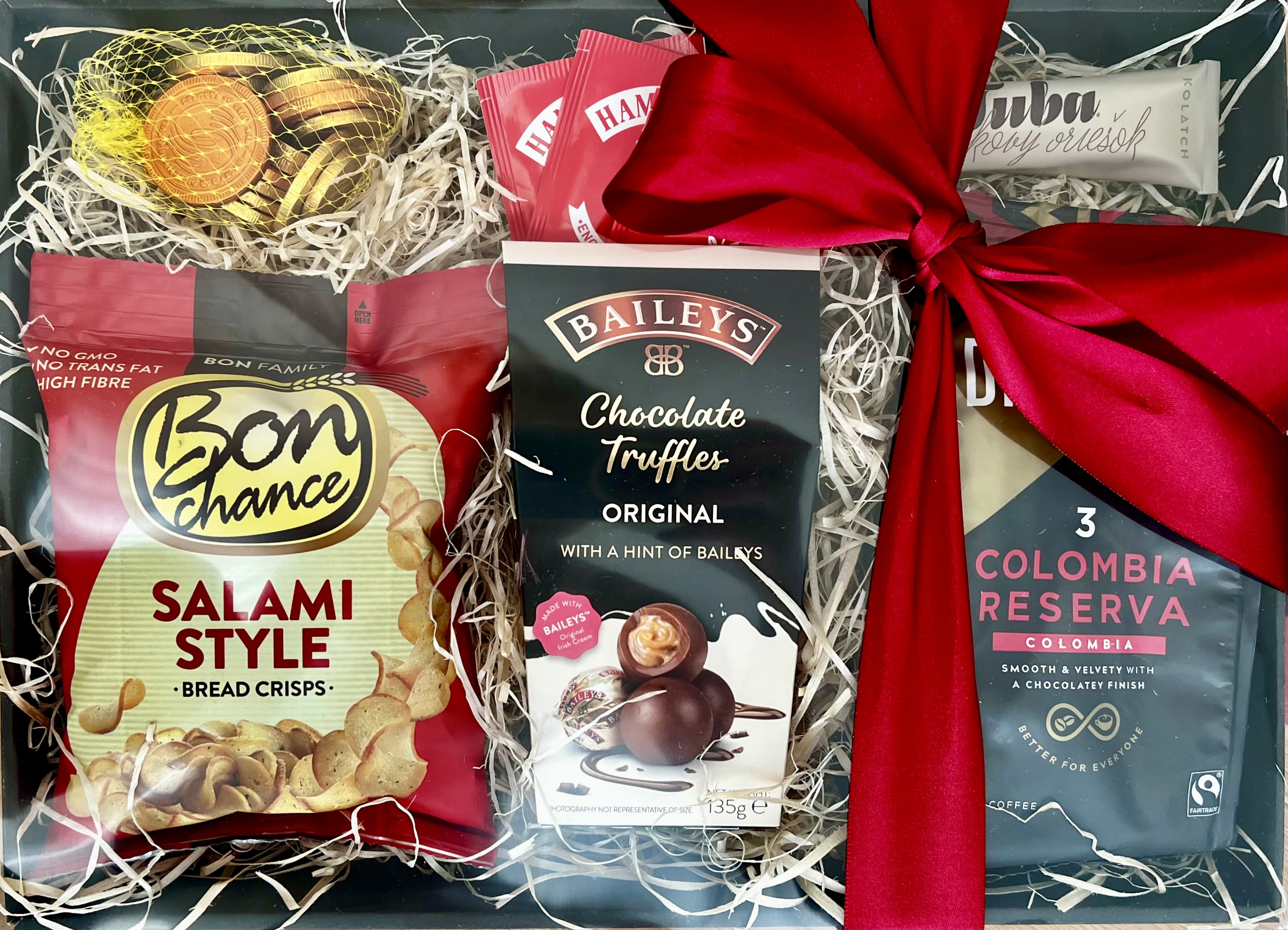 Dárkový balíček obsahuje: Chlebové chipsy salámové 60g, Baileys čokoládové truffle pralinky 135g, Tuba dezert lískový oříšek 45g, Colombia mletá káva 100% Arabica 200g, Mléčné čokoládové mince 26% 65g. Balíček je balen v černé krabici s průhledným víkem a provázaný červenou saténovou stuhou. Rozměr: 350x200x100mm. Váha: 550g