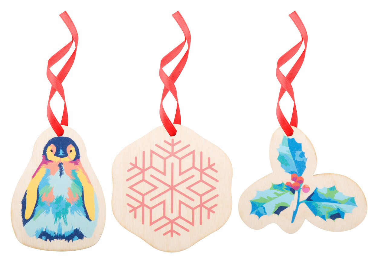 Vlastní ozdoba na vánoční stromek z březové překližky s vlastním tvarem a barevnou grafikou. Maximální velikost: 80x80 mm. Cena zahrnuje jednostranný UV LED tisk včetně přípravy tisku. Dodává se samostatně se stuhou. Minimální množství: 100 ks.