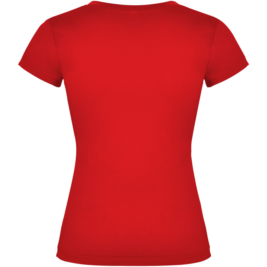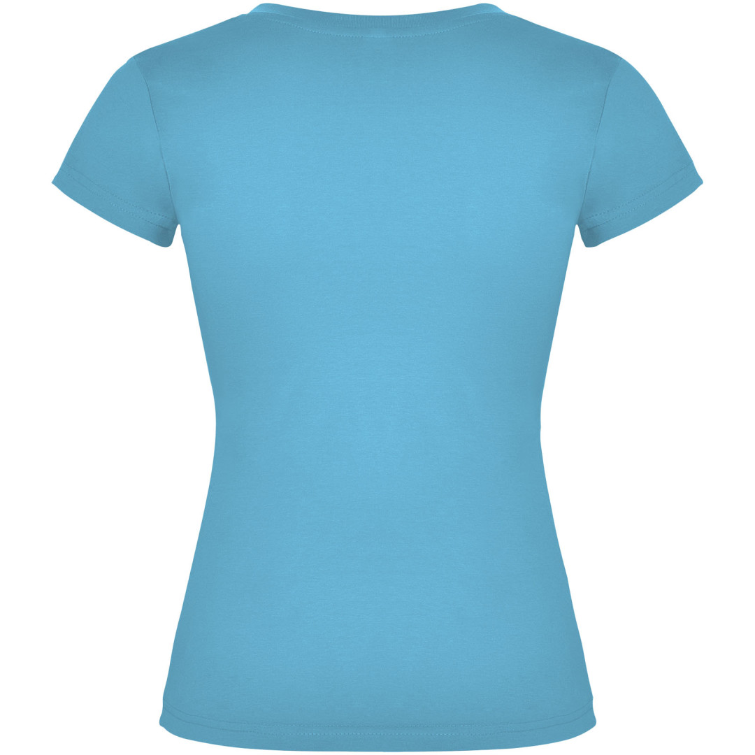 Dámské tričko s krátkým rukávem a výstřihem do V s úpravou 1x1 žebrování. Úzký střih s bočními švy. Odnímatelný štítek. Modelka měří 174 cm a má na sobě velikost S.