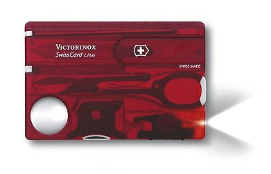 SwissCard Lite obsahuje: 1. nůž na otevírání listů (čepel) 2. nůžky 3. nerezový špendlík 4. kuličkové pero 5. pinzeta 6. lupa 7. šroubovák 3 mm 8. šroubovák 5 mm 9. křížový šroubovák 00-0 10. šroubovák 1-2 11. LED světlo 12. pravítko (cm) 13. pravítko (palce)