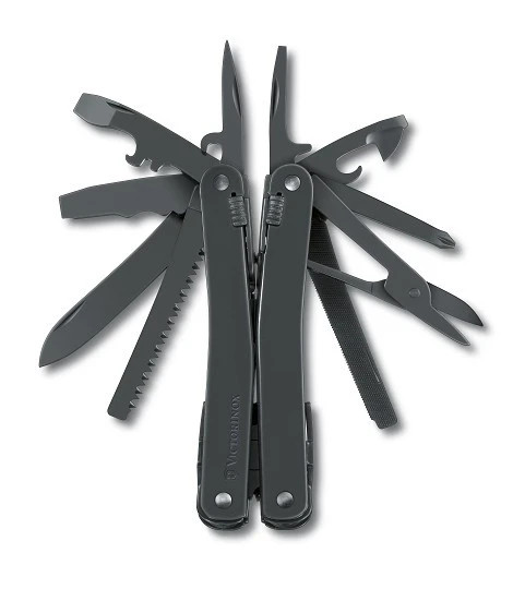 Multifunkční nářadí obsahuje: 1. tenké kleště 2. šroubovák 2 mm 3. šroubovák 3 mm 4. nůžky na tenký a měkký drát až do 40 HRc 5. otvírák na láhve 6. šroubovák 6 mm 7. páčidlo 8. čepel se špičkou 9. nůžky 10. pilník na železo 11. pilka na železo 12. pilka na dřevo 13. děrovač, výstružník 14. křížový šroubovák 1+2 15. dláto a škrabka 16. čepel na podélné řezání izolace drátů8. drátů 19. čepel pro točité řezání izolace drátů 20. otvírák na konzervy 21. víceúčelový hák 22. vojenské pouzdro 23. otvor pro připevnění vývrtky 24. nůžky na tvrdý drát 25. otvor pro lanko 26. deset samostatných pružin 26. deset samostatných pružin 27. pojistka