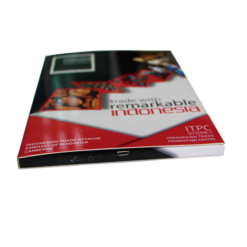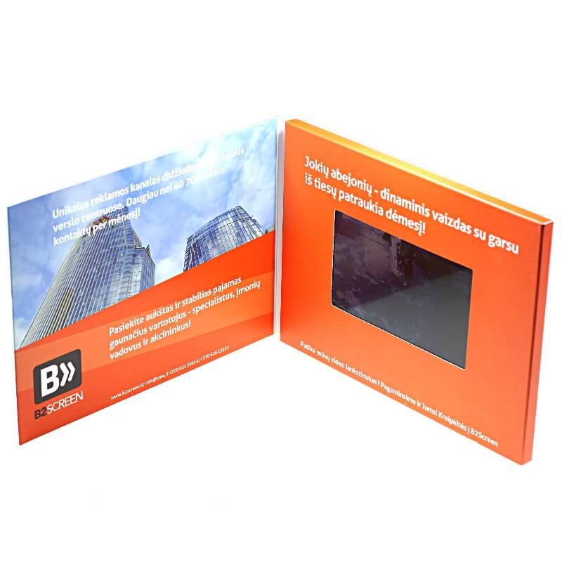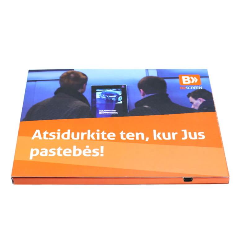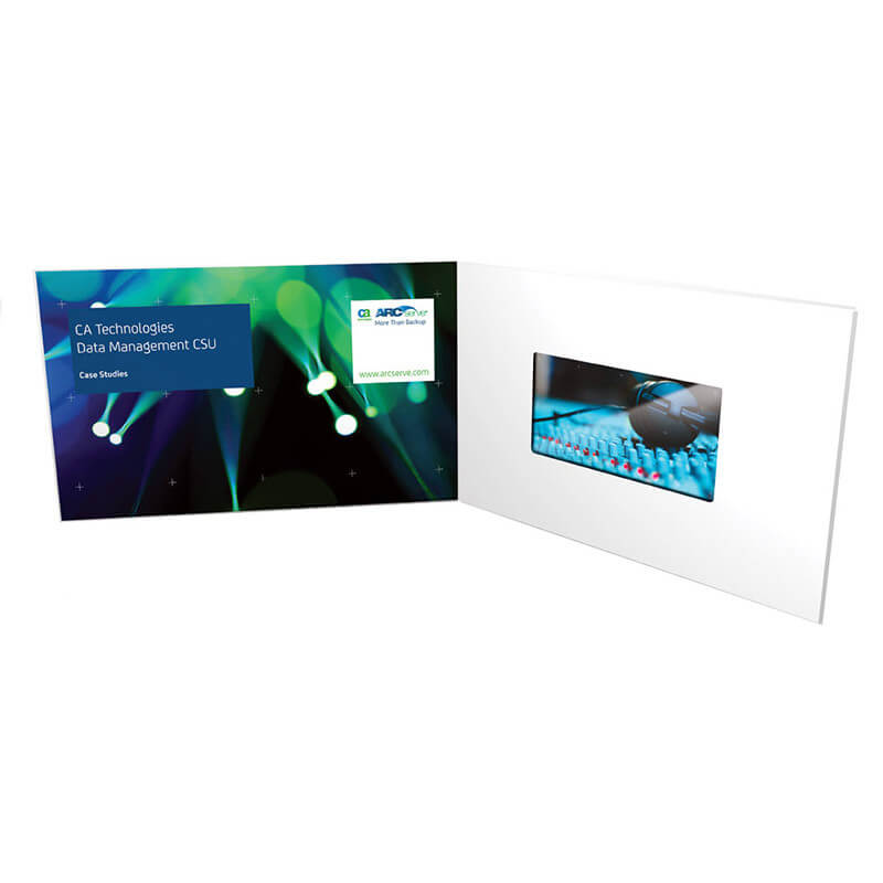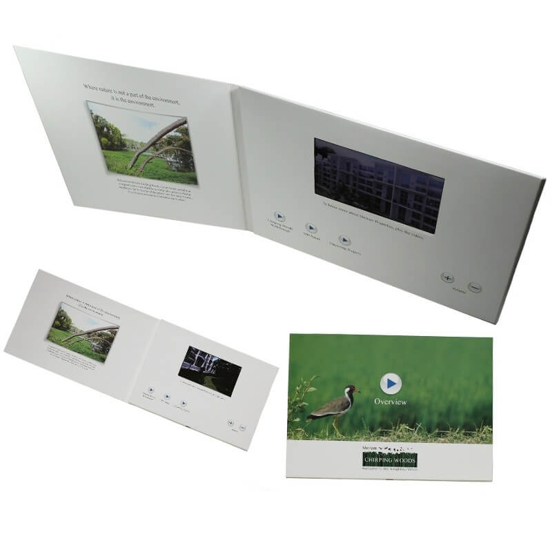 Video brožura (videobooklet) - digitální prezentace nové generace! Tato hi-tech prezentace dozajista zaujme pozornost Vašich klientů. LCD displej zasazený v luxusních prezentačních deskách, potištěných ve Vašem designu. Po otevření desek se ve smyčce začnou přehrávat videosoubory, které mohou být rovněž spuštěny individuálními tlačítky. Oblíbená je rovněž varianta, kdy jednotlivá tlačítka spouští stejné video v různých jazykových mutacích. Zvuk hraje ze zabudovaného reproduktoru nebo přes sluchátka. Možnost přidání tlačítek pro ovládání hlasitosti. Skvěle se hodí jako prezentace firmy či produktu, efektní pozvánka na akce nebo třeba jako originální PFko. Videa je možné po přehrání nahradit jinými, díky dobíjecí baterii je možné video brožury používat dlouhodobě.